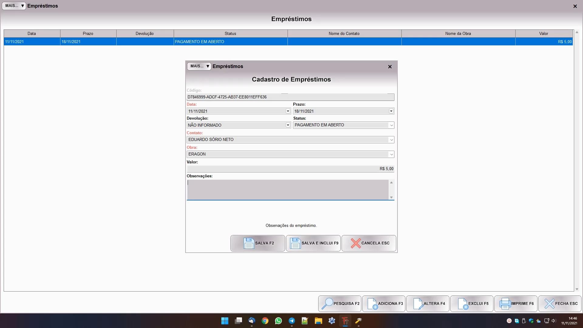 CONTATO e OBRA: selecione o contato e o filme previamente cadastrados. Teclar INSERT sobre o campo permite que seja feito um novo cadastro, e teclar F3 permite alterar o cadastro selecionado;