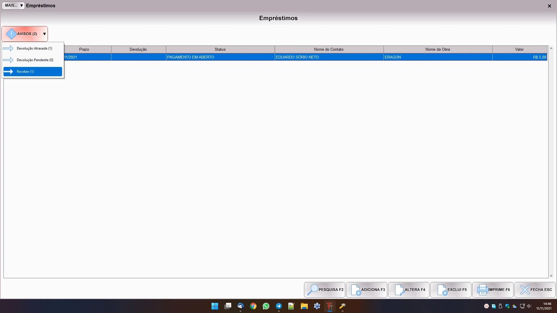 Ao salvar o empréstimo o sistema atualiza os avisos. Empréstimos com status PAGAMENTO EM ABERTO aparecerão como RECEBER no botão AVISOS. Caso o empréstimo esteja com status PAGAMENTO EM ABERTO ou PAGO, e com a data de PRAZO preenchido e a data de DEVOLUÇÃO em branco, também podem aparecer alertas de empréstimos com DEVOLUÇÃO PENDENTE ou DEVOLUÇÃO ATRASADA. Se não houver nenhum aviso o botão desaparece.