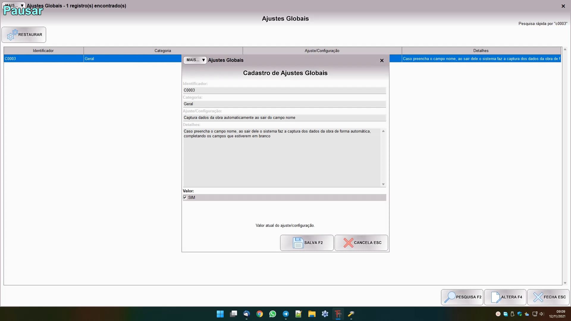 Digite C0003 e tecle ENTER para encontrar a configuração que vamos alterar. Fazendo isso verá uma configuração “Captura dados da obra automaticamente ao sair do campo nome“. Altere e desmarque o campo SIM, fazendo isso a captura automática será desativada. Se desejar pode alterar depois e remarcar o campo para que ela volte ficar ativa.