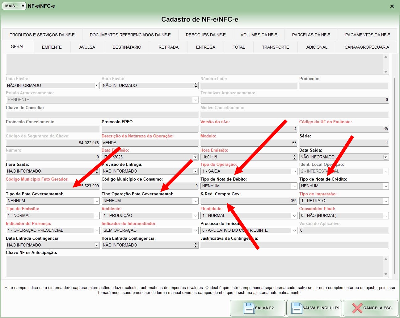 Uma vez preenchido o produto, vamos para a nota fiscal. Começando pela aba GERAL, existem alguns campos novos para notas de crédito, de débito, e de compra governamental: