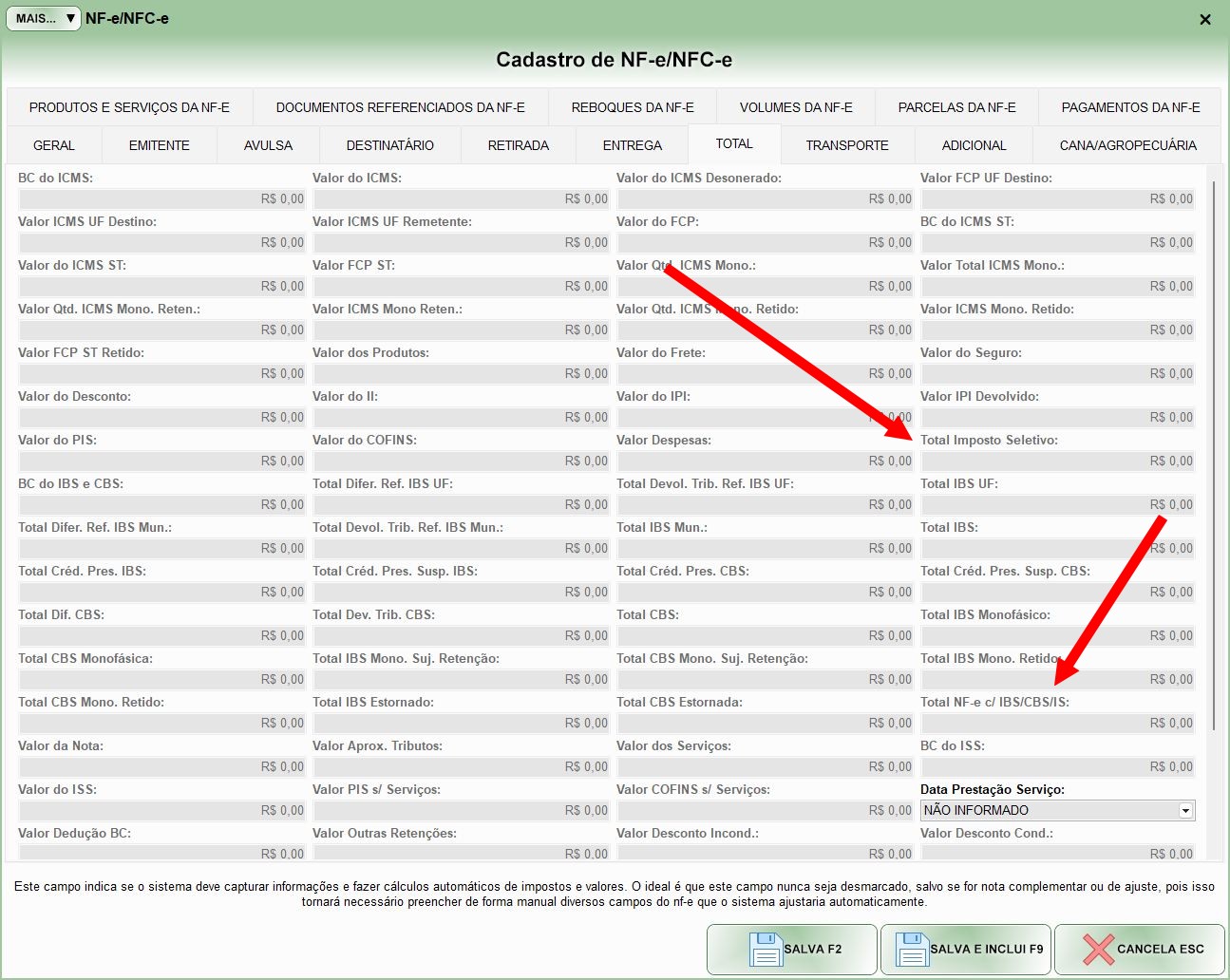 Na aba TOTAL, temos novos totalizadores para cada base e imposto, começando no total do imposto seletivo e terminando no total da NF-e com os impostos: