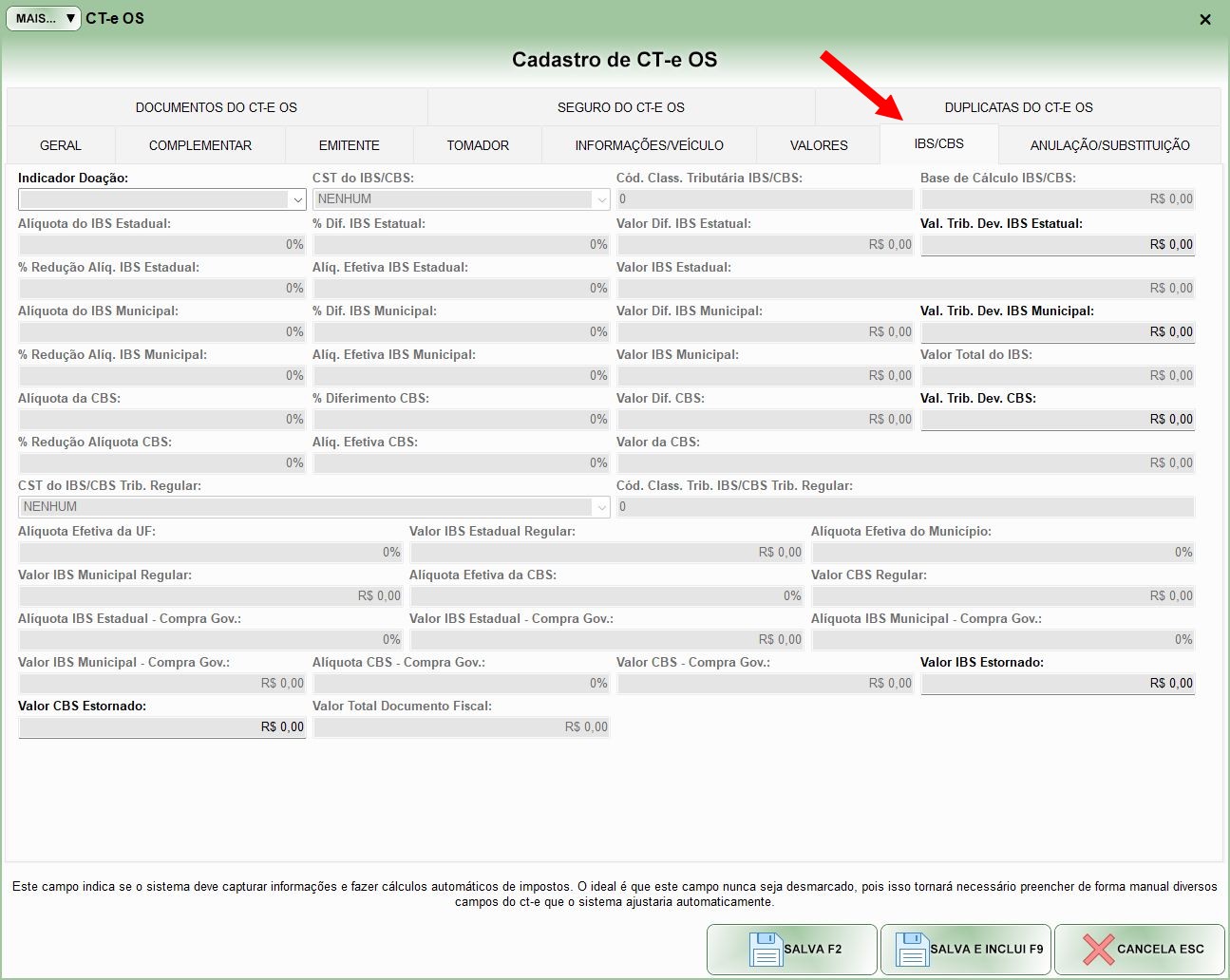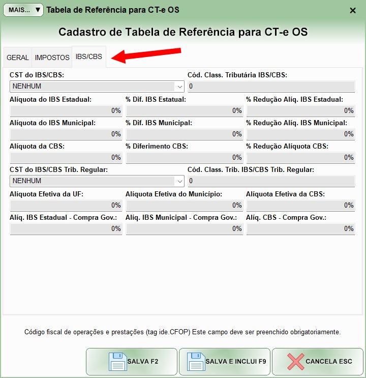 Preencha a tributação de acordo com as orientações do seu contador. Uma vez preenchida, você poderá selecionar essa tabela no CT-e OS, onde também encontrará uma aba IBS/CBS com os novos impostos: