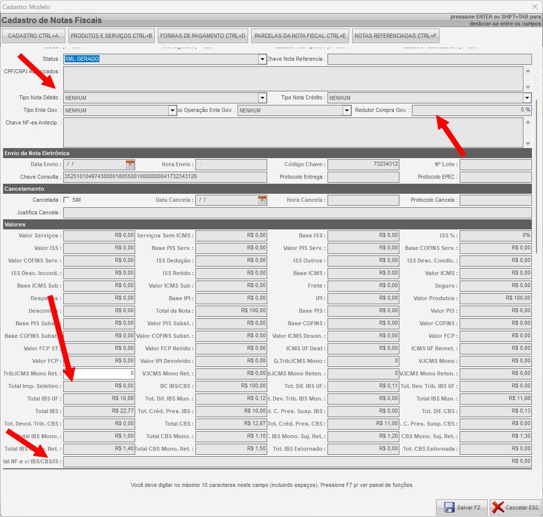 Aqui quase todos os campos são capturados e/ou calculados, e por isso estão bloqueados, porém ainda existem algumas informações que podem variar de um documento para outro e estão disponíveis para digitação, como por exemplo o valor de IBS ou CBS estornado.
