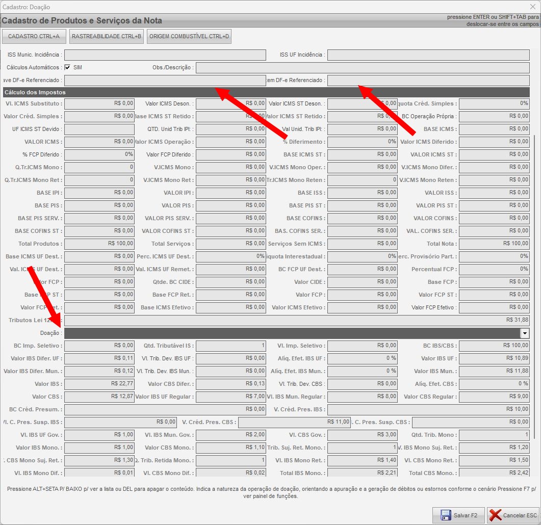 Nessa imagem acima tempos os campos para referenciar os documentos fiscais de origem na parte superior, e temos na inferior os novos campos do IBS, começando pelo indicador de doação. O sistema calcula a maior parte deles de forma automática, mas alguns podem ser manualmente informados, como por exemplo o tributo devolvido e o estorno.
