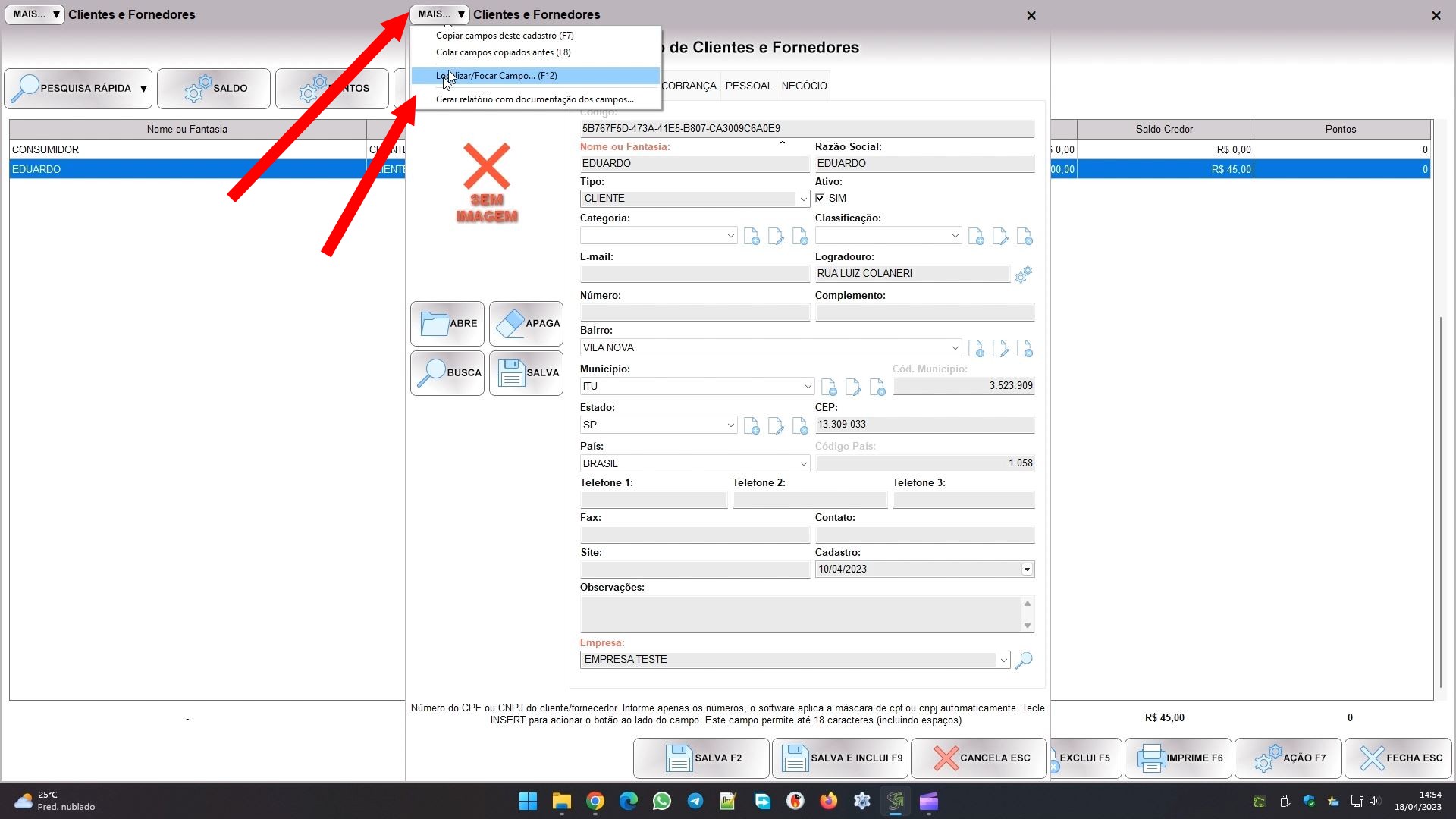 Em qualquer cadastro do sistema, clique no botão MAIS no topo da tela, e em LOCALIZAR / FOCAR CAMPO (F12):