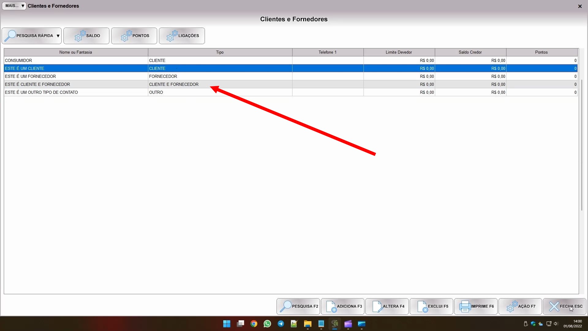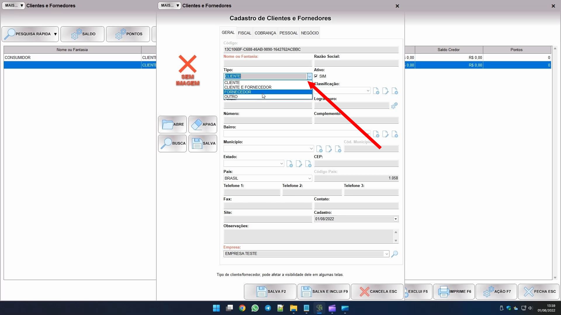 Ao cadastrar um cliente ou fornecedor, você verá logo no começo do cadastro o campo tipo, como mostra a imagem abaixo: