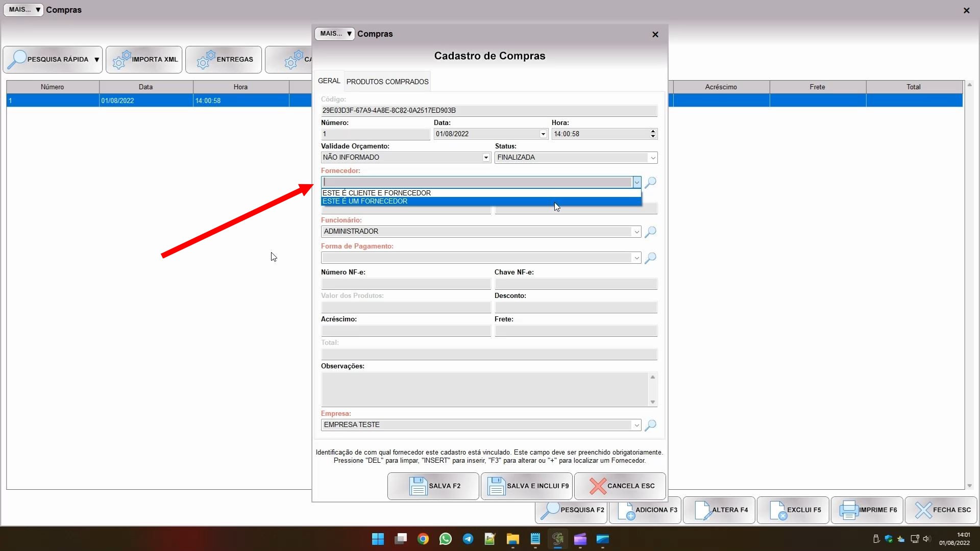 Se tentarmos registrar uma compra de produto, o sistema terá um campo FORNECEDOR. Note que nele só posso selecionar os cadastros que correspondem a um fornecedor.