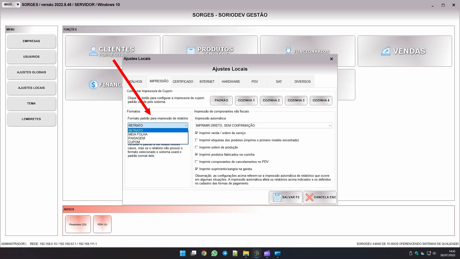 Voltando a tela de ajustes locais, a segunda seção fica à esquerda na tela, e nela você encontra um campo FORMATO PADRÃO PARA IMPRESSÃO DE RELATÓRIO. O sistema trabalha com até 4 formatos: RETRATO, MEIA FOLHA, PAISAGEM e CUPOM. Naturalmente, nem todos os relatórios do sistema tem estas 4 opções. Estatísticas, por exemplo, vão ser impressas geralmente em RETRATO ou PAISAGEM, não é viável imprimir em cupom.