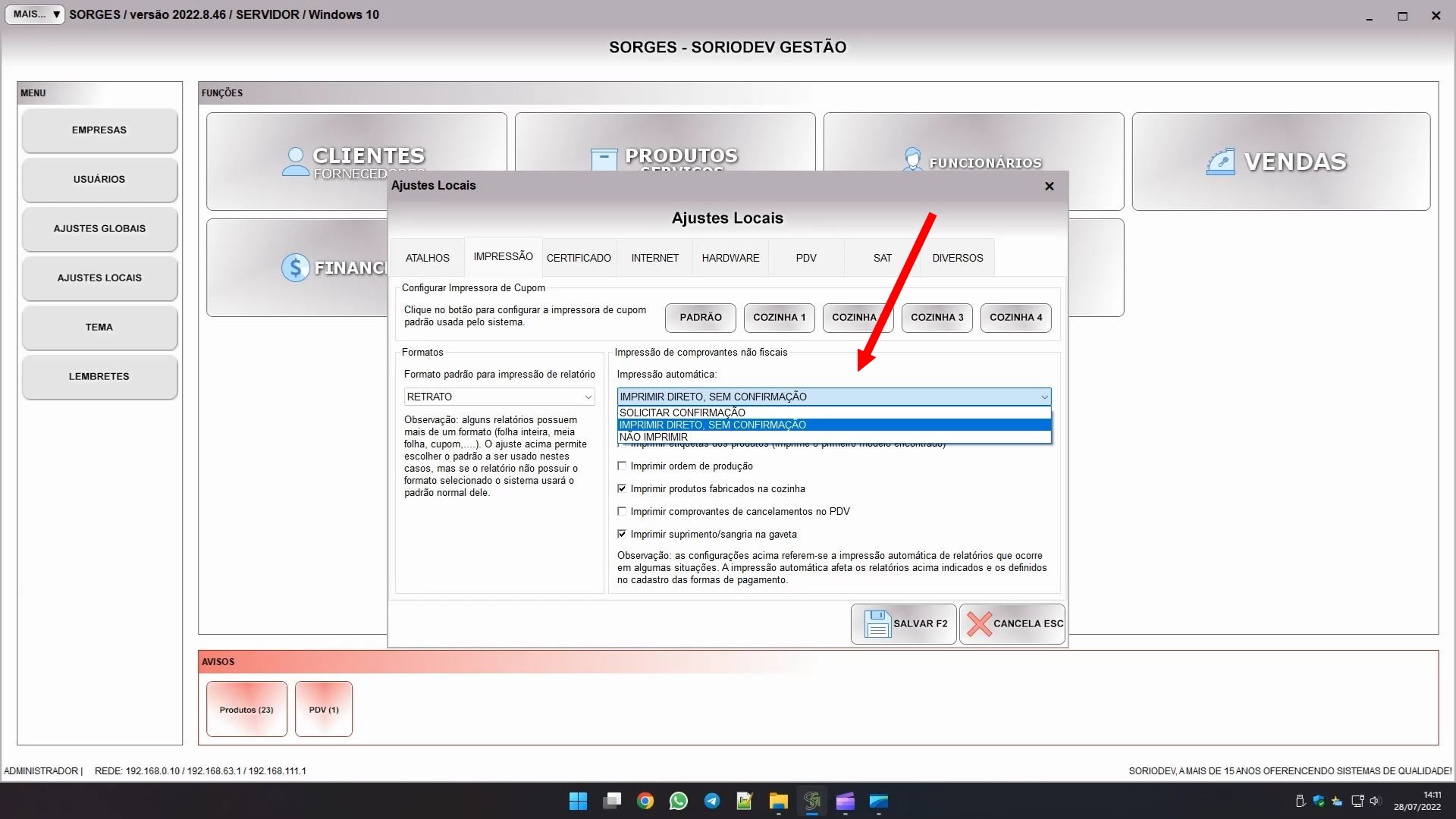 É bastante normal, principalmente no pdv, que ao realizar alguma operação o sistema imprima de forma automática algum relatório. Por exemplo, ao fechar uma venda, imprimir o DAV dela. O campo IMPRESSÃO AUTOMÁTICA permite configurar isso, nele você escolhe se vai perguntar, se vai imprimir automaticamente, ou se não vai imprimir.