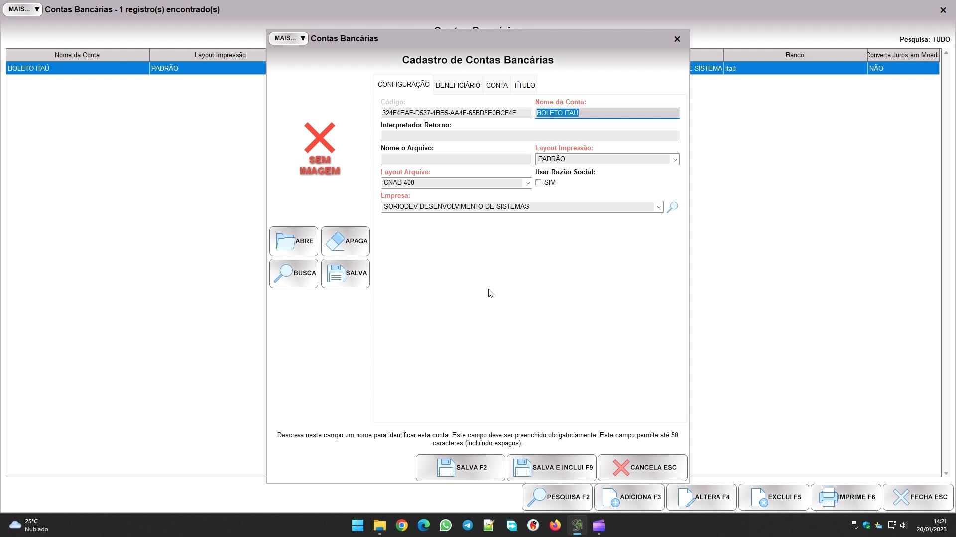 A primeira aba é a de CONFIGURAÇÃO. Em NOME DA CONTA só descreva algo que a identifique no sistema, pois ela será selecionada em outros módulos.
