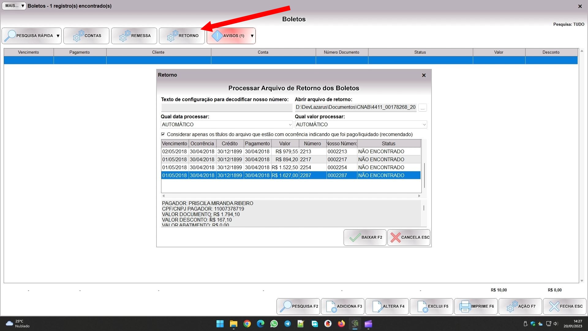 Para processar os arquivos de retorno recebidos do banco você usará a função RETORNO:
