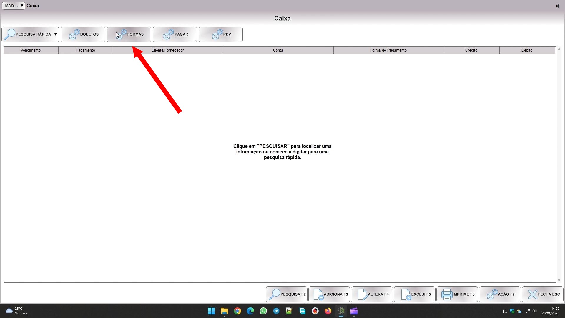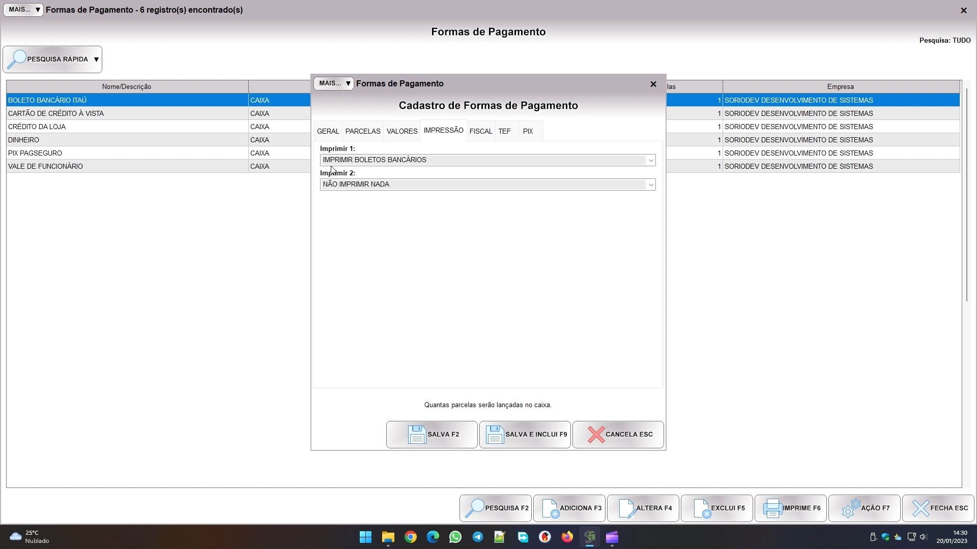 Até aqui explicamos tudo sobre o boleto em si, porém precisamos vincular, fazer o link dele com o resto do sistema. Por exemplo, quando você vender no boleto é preciso especificar nas formas de pagamento isso. E assim você matou a charada, precisamos criar ao menos uma forma de pagamento para ele, e fazemos isso no FINANCEIRO, no botão FORMAS: