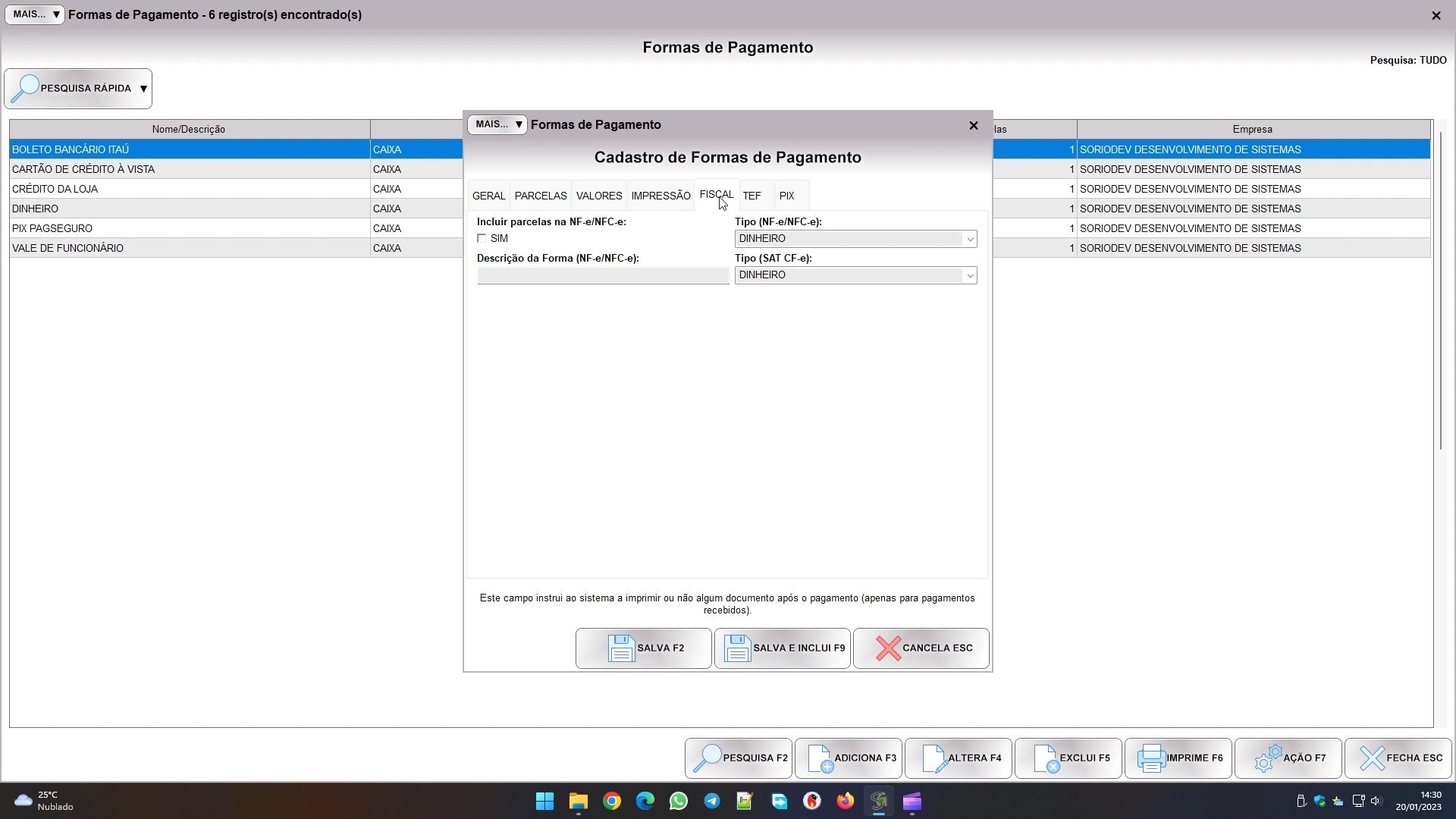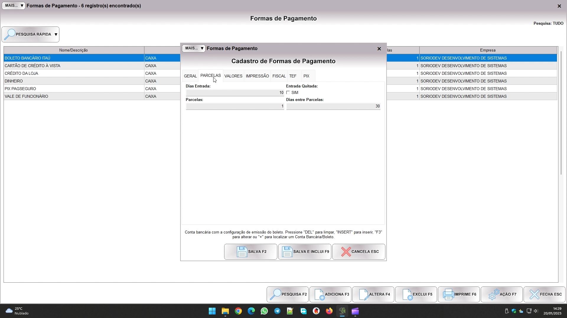 Se emite documentos fiscais no sistema é recomendável selecionar nos “tipos” a forma de pagamento que corresponde ao boleto, para que o documento fiscal seja declarado de forma correta para a receita.