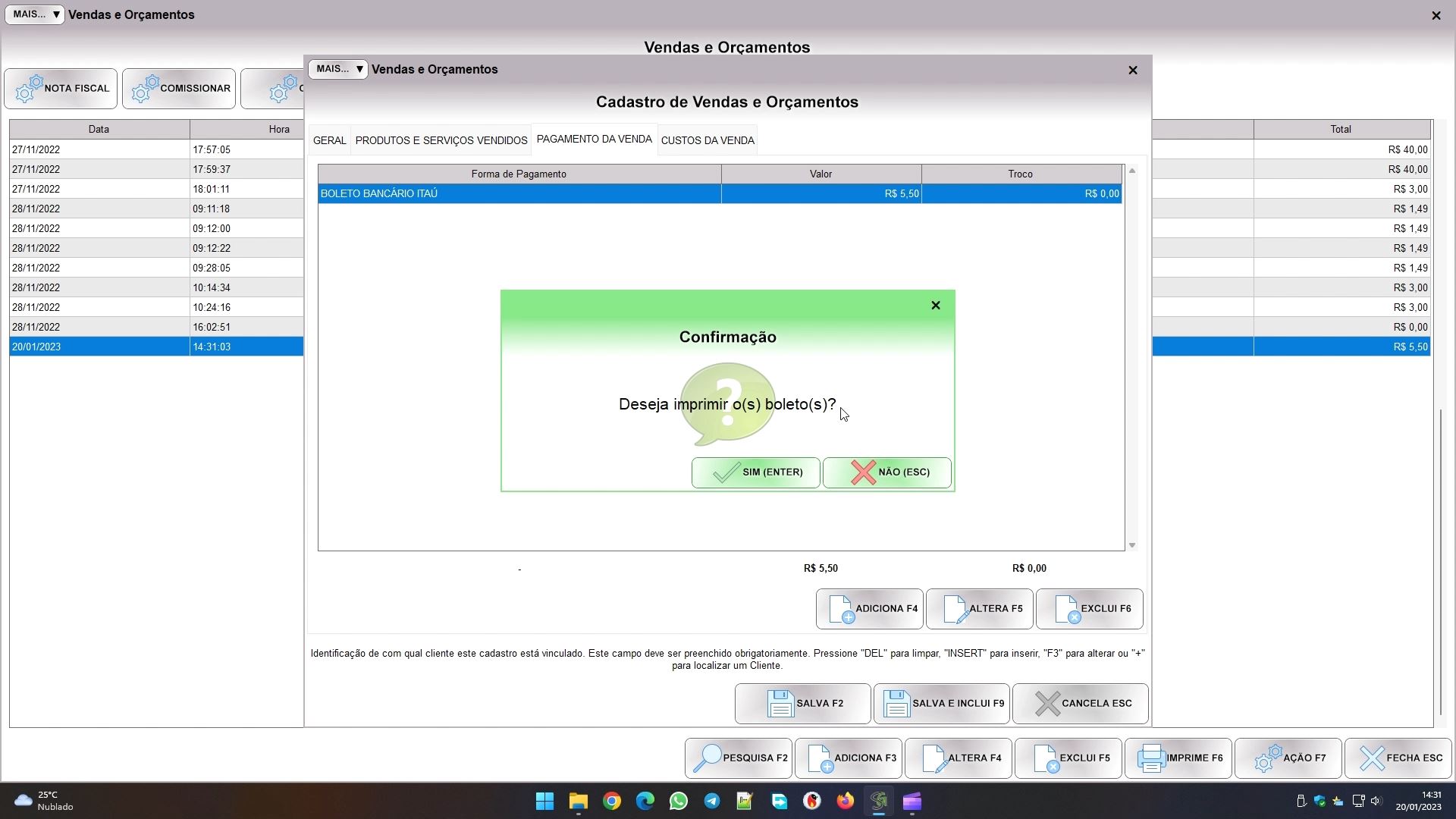 Por fim, um exemplo prático. Ao fazer uma venda, podemos selecionar a forma de pagamento boleto, e com isso o sistema nos questionará sobre a impressão dele: