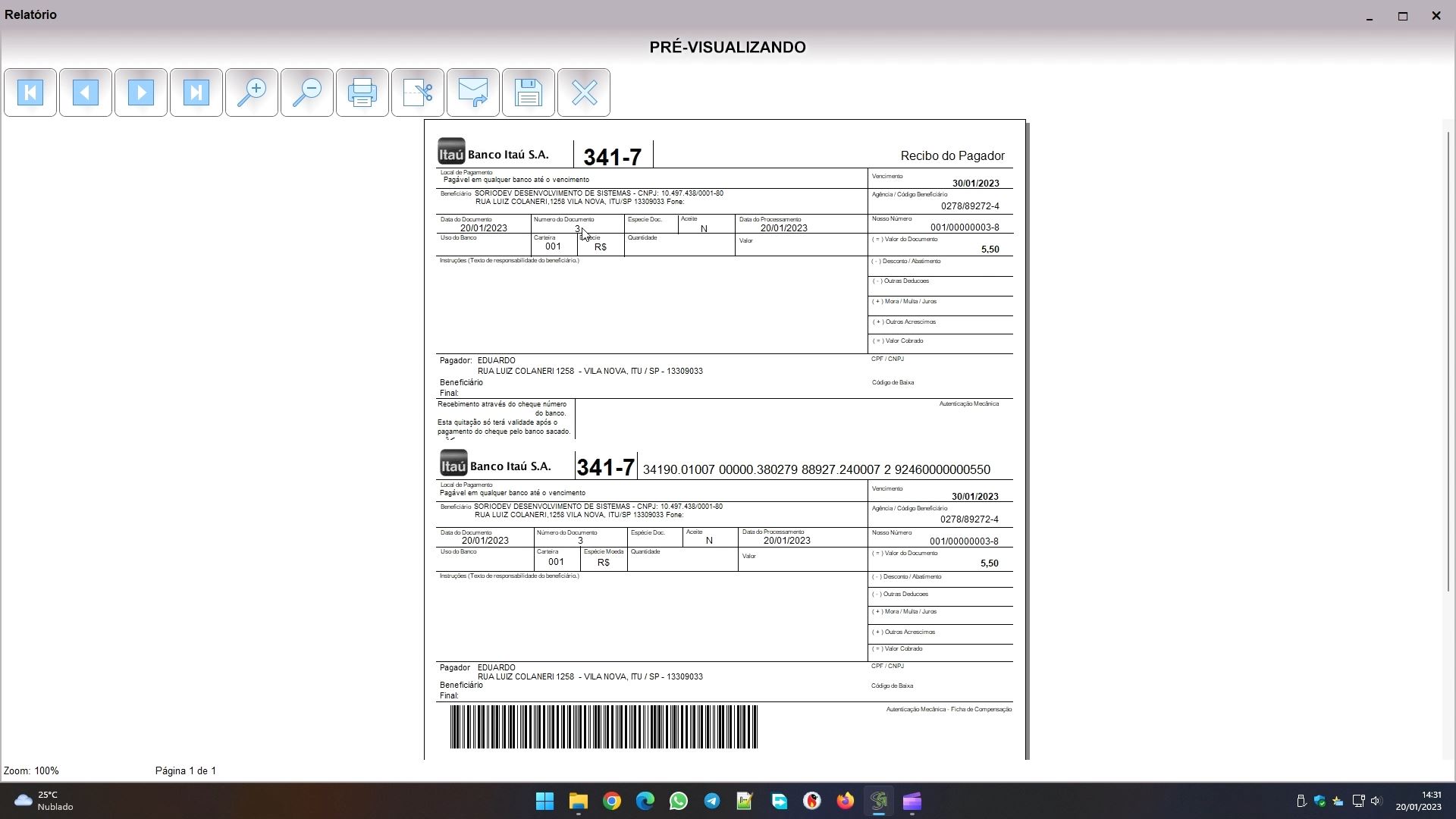 Teremos a impressão, similar a da imagem O boleto vai ficar registrado lá em FINANCEIRO, em BOLETOS. O registro do pagamento, seja manual ou por arquivo de retorno será feito por lá, e enquanto o boleto ficar em aberto ele não gera lançamento no financeiro. Quando o pagamento do boleto for registrado ele finalmente cairá no financeiro.