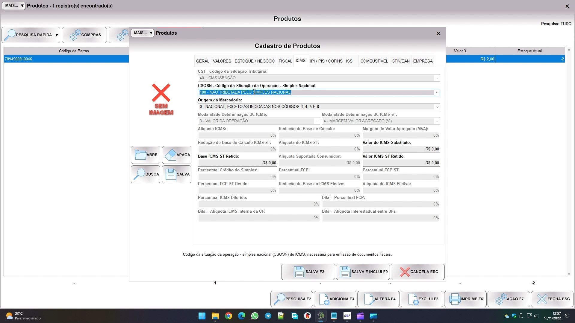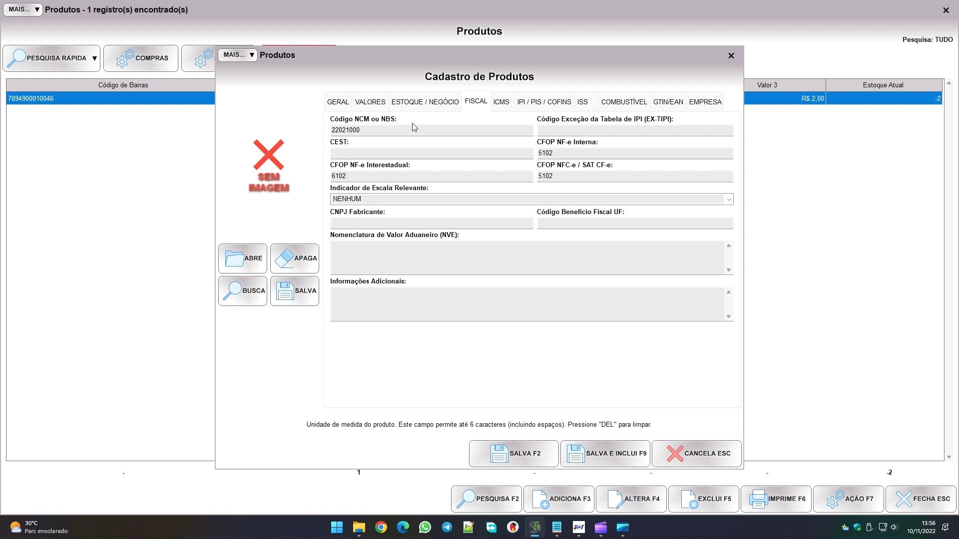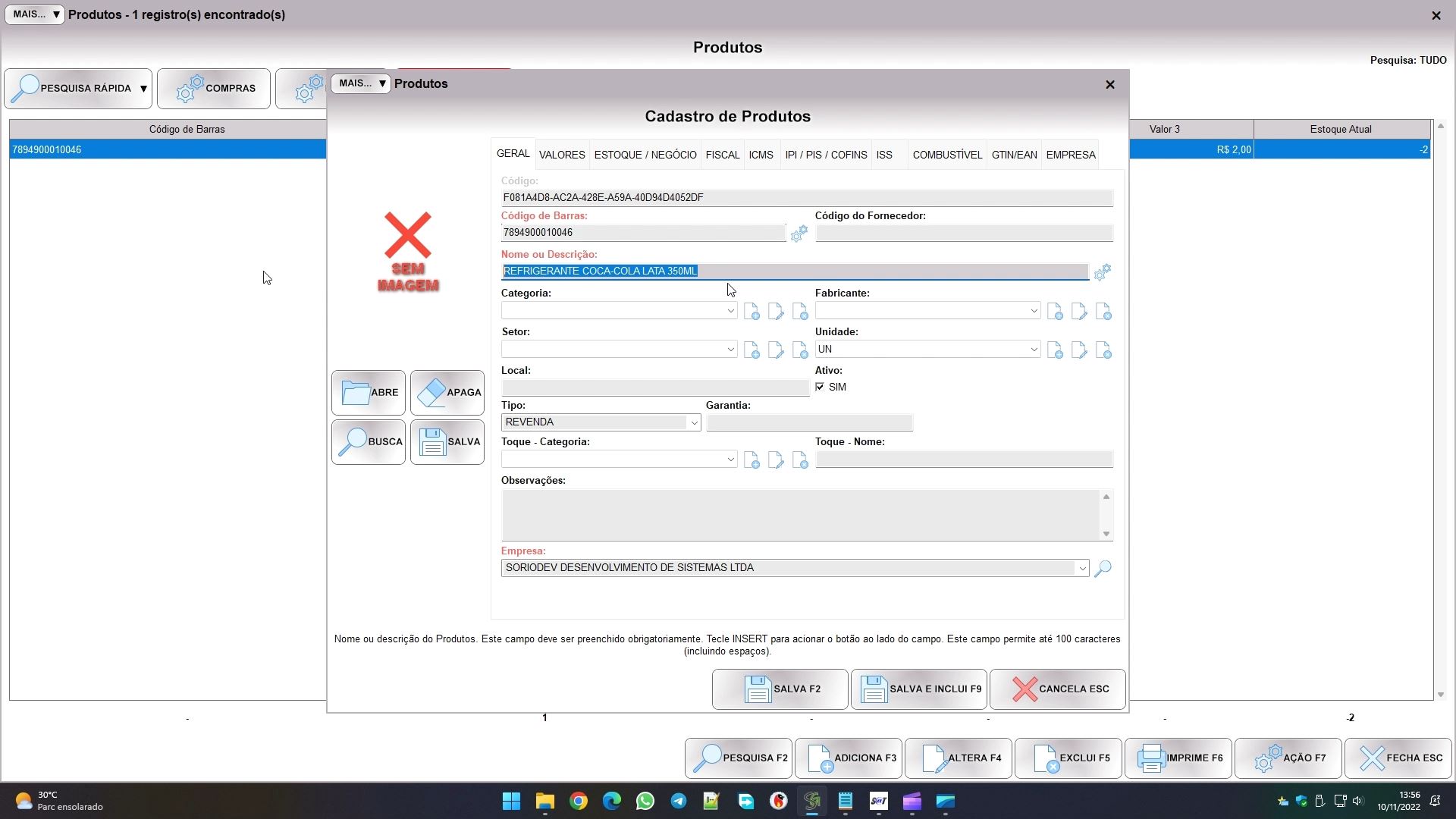 Na aba geral preencha o campo código de barras (pode ser um código inventado), a descrição e a unidade de medida.