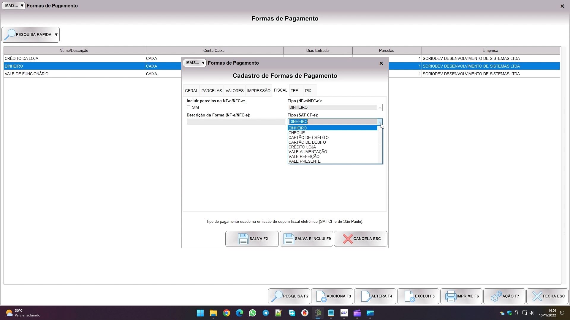 Cada forma terá o campo TIPO (SAT CF-e), é importante ficar atento a ele, pois para o aparelho a forma considerada será a opção selecionada neste campo. Se cadastrar uma forma que represente o pix selecione pagamento instantâneo, por exemplo.