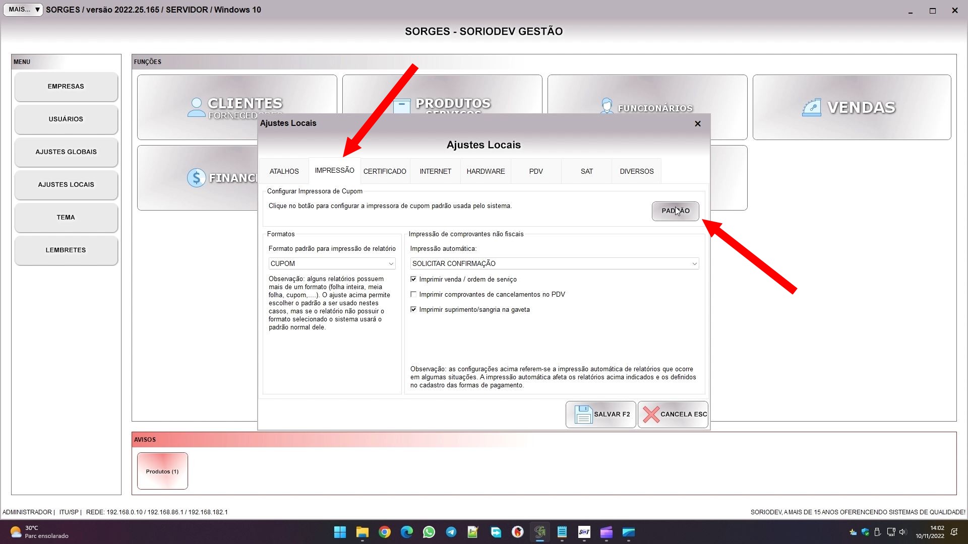 E para finalizamos as configurações, vá em AJUSTES LOCAIS, à esquerda na tela inicial. Na aba IMPRESSÃO clique em PADRÃO para configurar a impressora de cupom padrão do sistema.