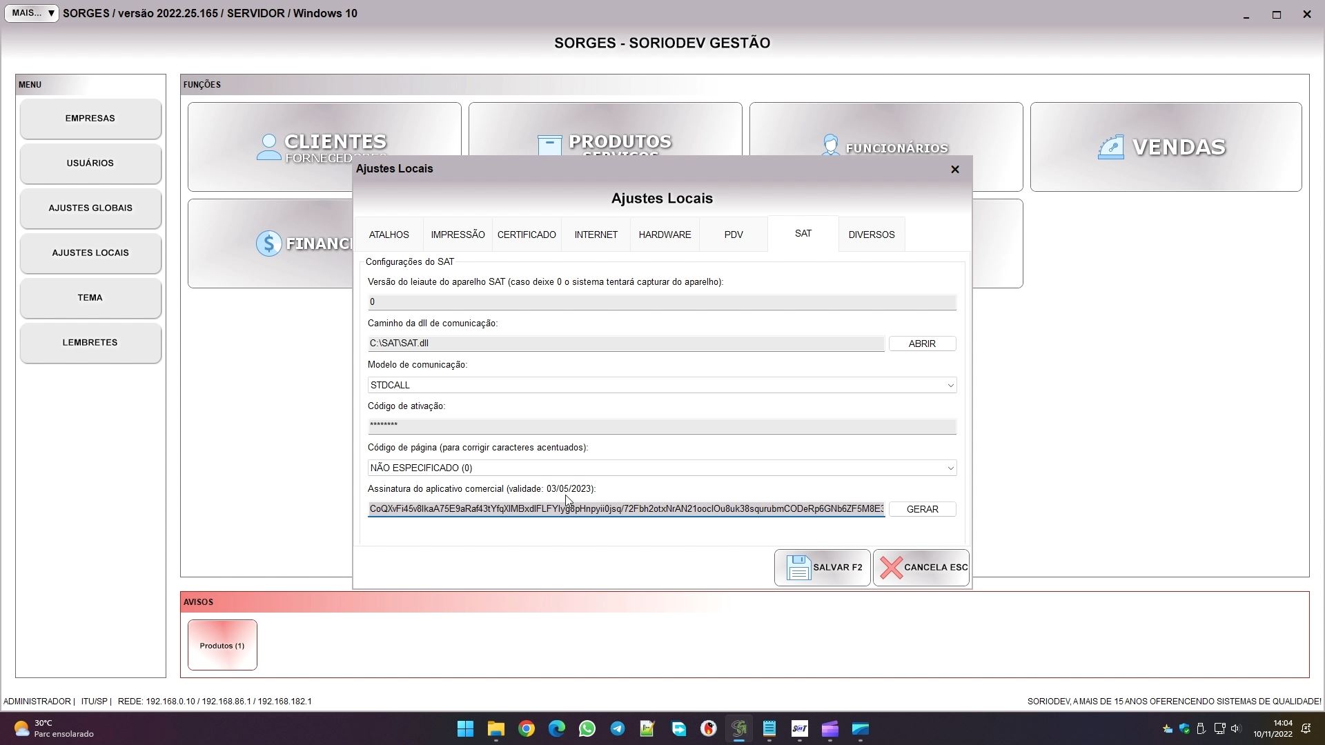 Voltando na tela de ajustes locais, na aba SAT vai configurar o vínculo com o aparelho.