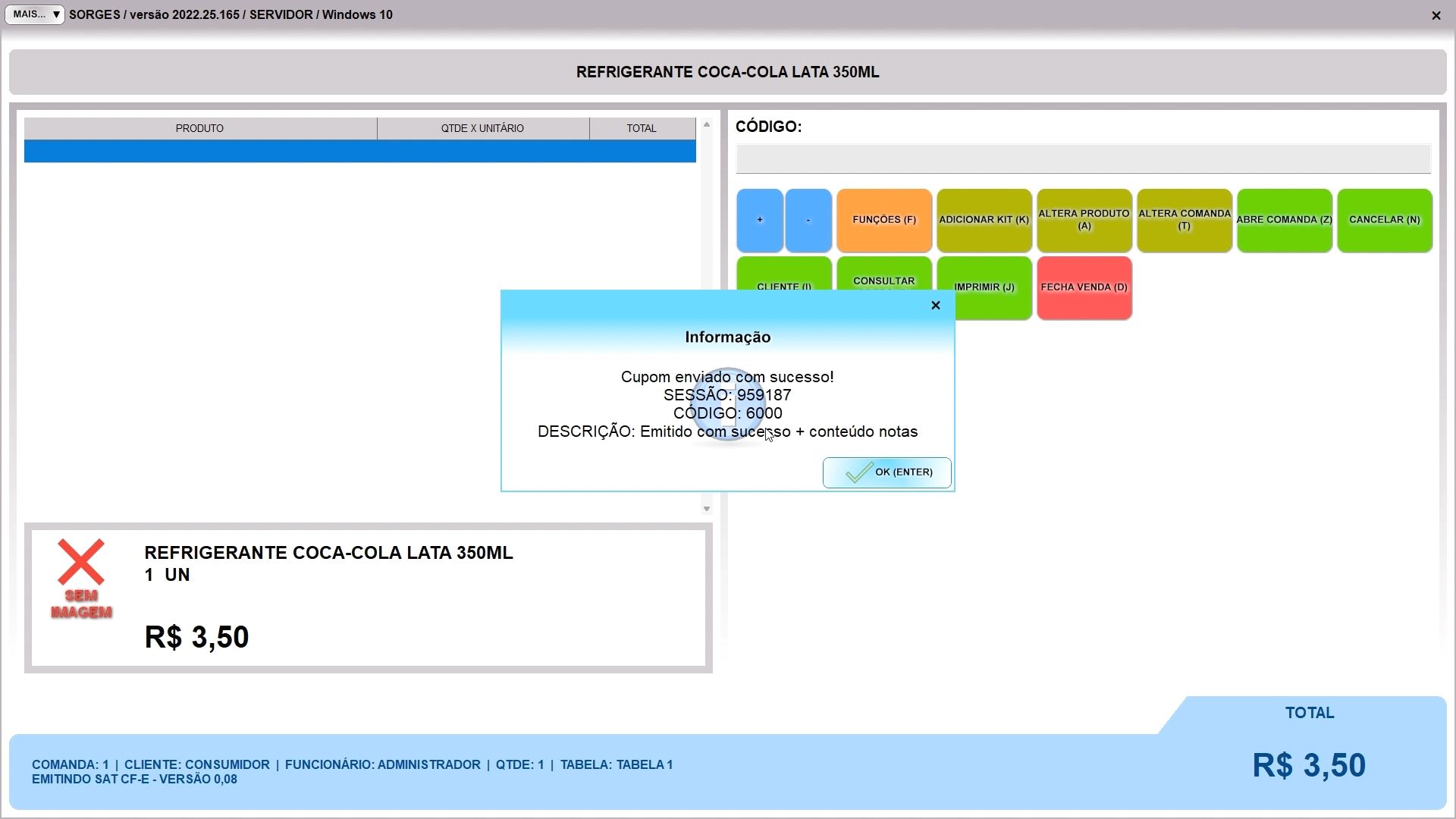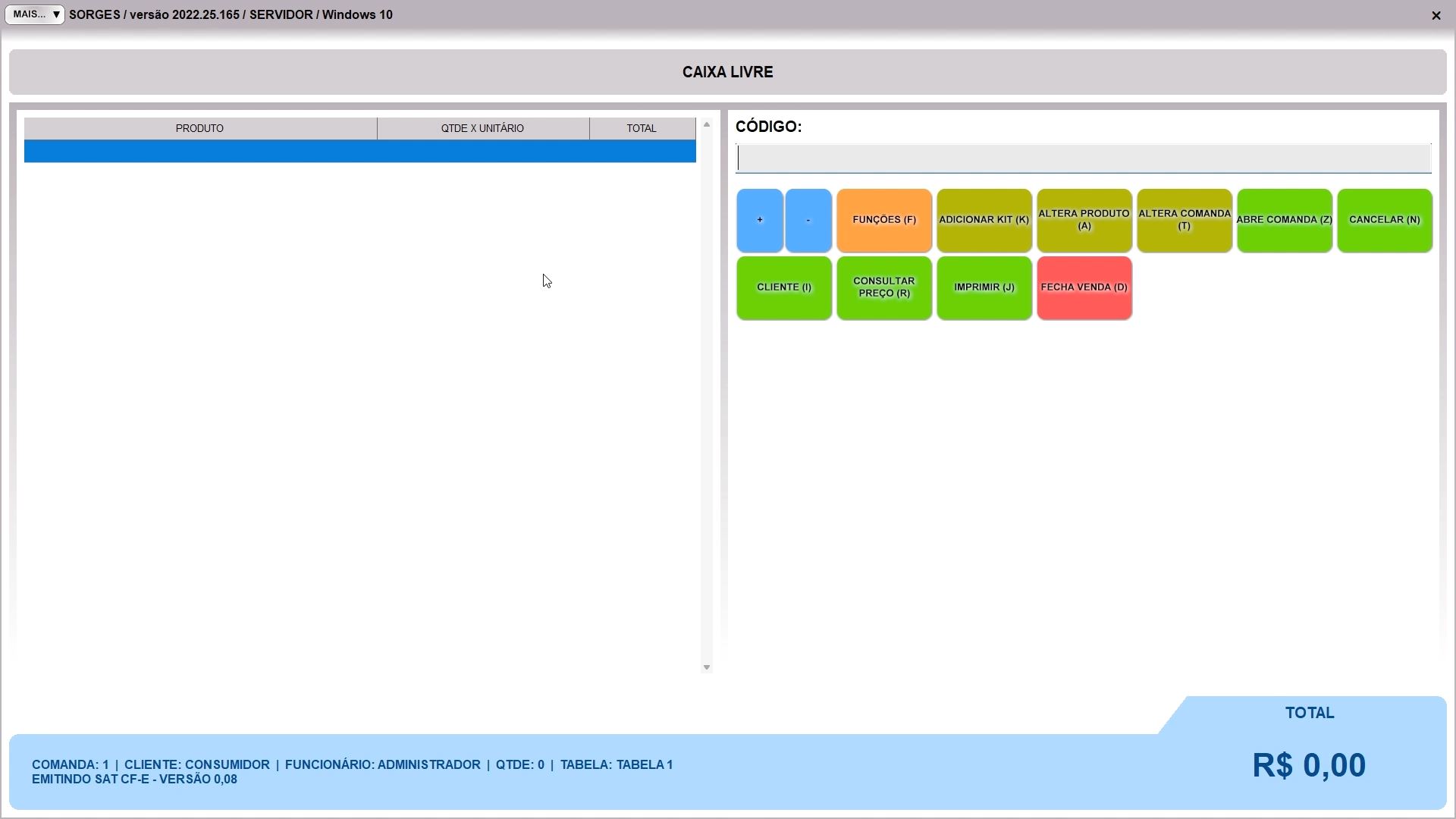 A tela do PDV trabalhando de forma fiscal com o SAT mostra uma mensagem no rodapé, EMITINDO SAT CF-E, e a versão do layout na frente. A tarja azul com esta mensagem indica que a emissão está normal. Se ocorrer algum problema a tarja no rodapé ficará amarela ou vermelha, aí depende da mensagem que estiver vendo para saber qual ação é necessária.