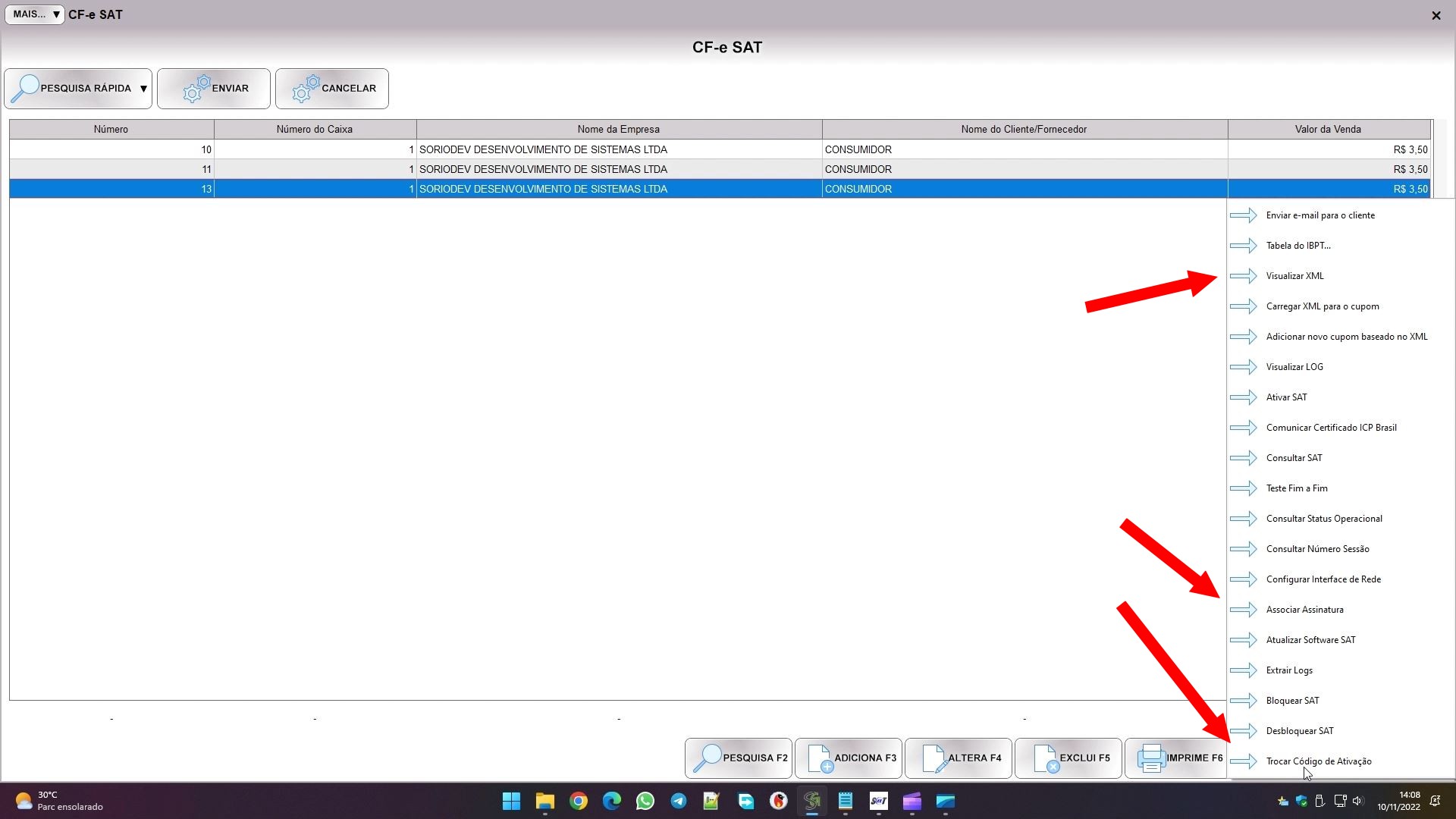 Nesta tela o botão ação lhe dará muitas funções. Duas delas que provavelmente lhe interessarão são a função ASSOCIAR ASSINATURA, que serve para fazer o vínculo da softhouse (nós) com sua empresa, é necessário usar esta função uma vez quando vai começar o uso do nosso software com o aparelho, ou usar esta função pelo ativador do fabricante. Outra função importante é a VISUALIZAR XML.