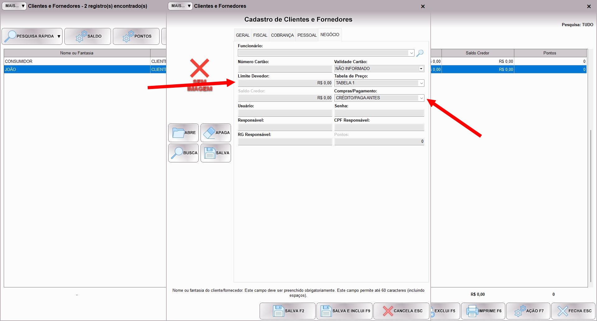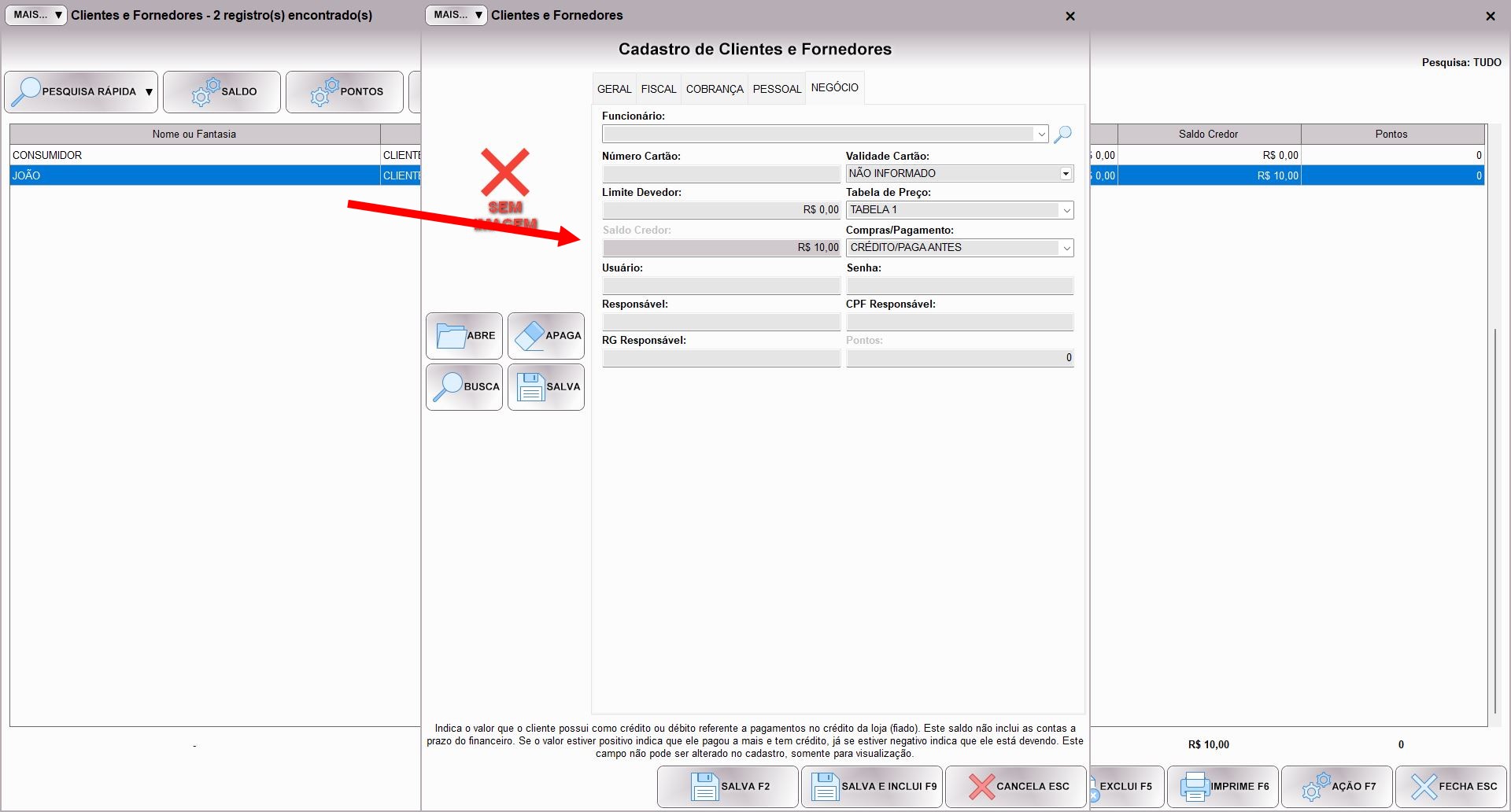 Quando voltar ao cadastro do cliente, na aba NEGÓCIO verá que o campo SALDO CREDOR ficou com o saldo pago pelo cliente. Obviamente não precisa fazer isso no dia a dia, estamos apenas mostrando o resultado. Agora ele pode comprar até o limite deste valor.