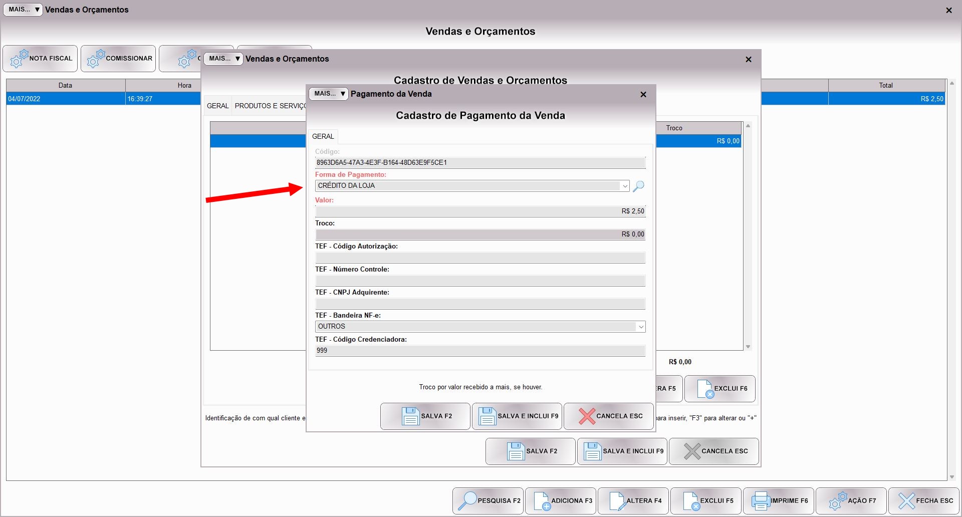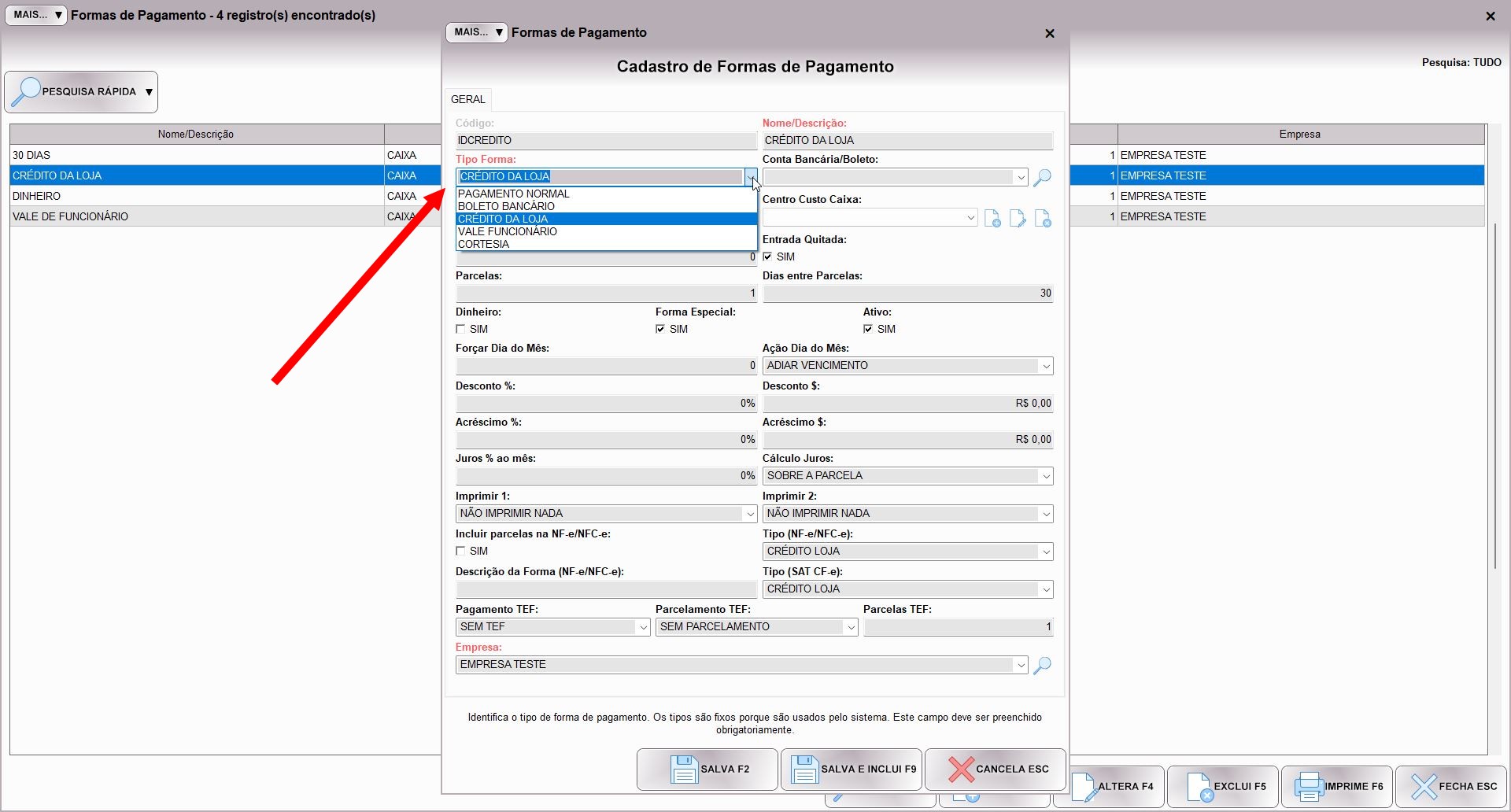 A forma CRÉDITO DA LOJA já vem criada pelo sistema, mas o importante não é o nome dela, e sim a opção selecionada no campo TIPO FORMA. Este campo define o comportamento da forma de pagamento no sistema, e quando ele está com a opção CRÉDITO DA LOJA selecionado o sistema vai lançar os valores no saldo do cliente, e não no fluxo financeiro. Ou seja, é o bom e velho “fiado”, porém neste caso, como o cliente não tem limite ele precisa pagar antes para consumir. Você pode mudar o nome da forma, ou mesmo criar mais formas se desejar.