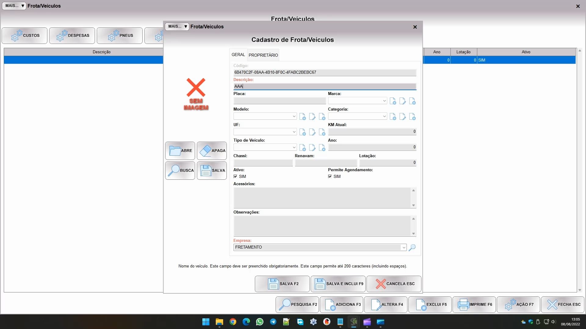 A DESCRIÇÃO do veículo serve para identificar ele no sistema. Quando for selecionar o veículo em alguma tela é esta descrição que verá, então você pode usar o que quiser, placa, marca, modelo, um código interno, fica a seu critério. No caso dos segmentos de frota e fretamento, além da descrição a KM ATUAL do veículo é importante, para controlar o deslocamento, a km nas despesas, o cálculo de consumo por km, etc… As demais informações ficam a seu critério, porém se vai emitir CT-e OS recomendo preencher os campos na aba GERAL (ano, chassi, renavam…).