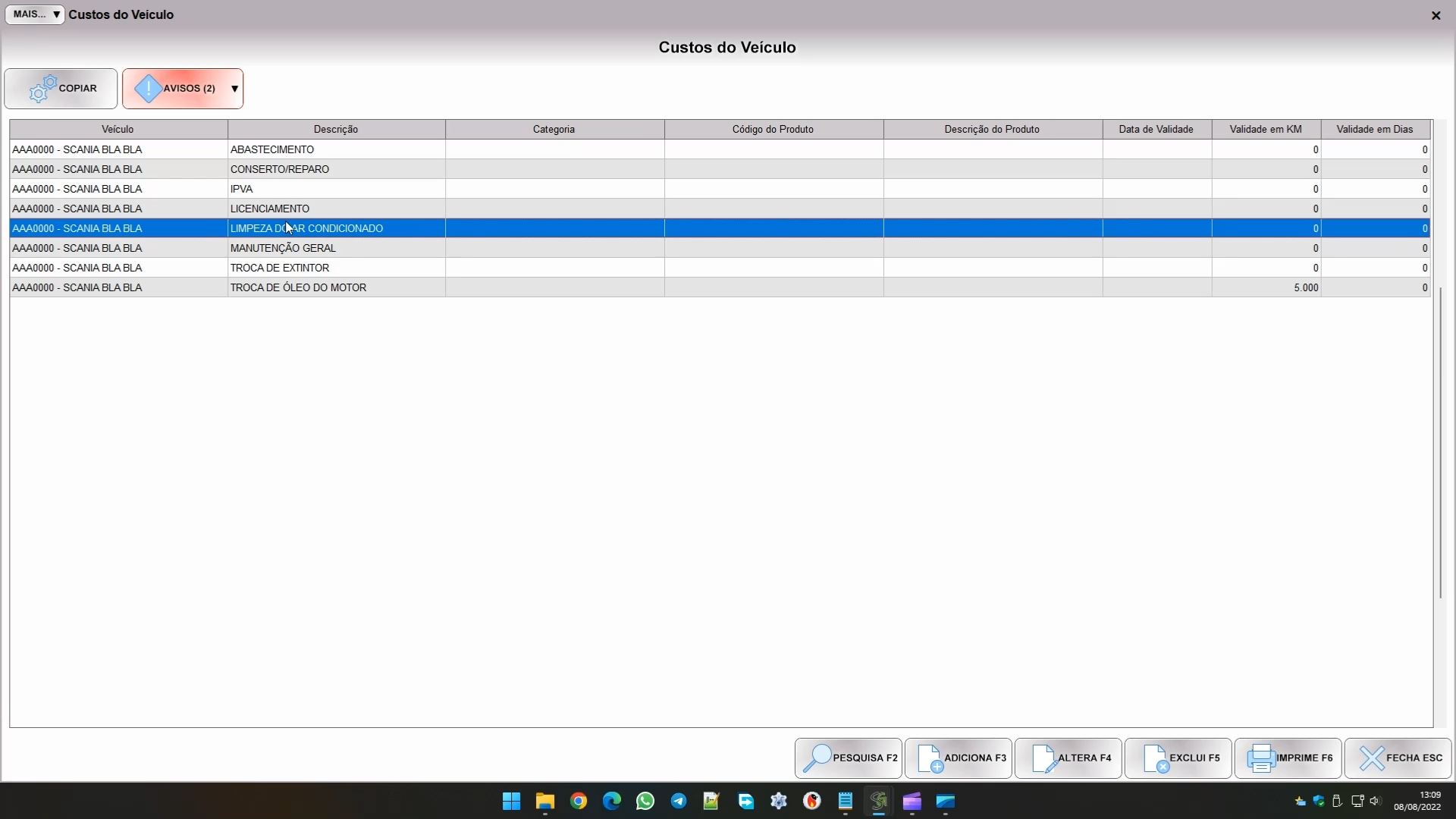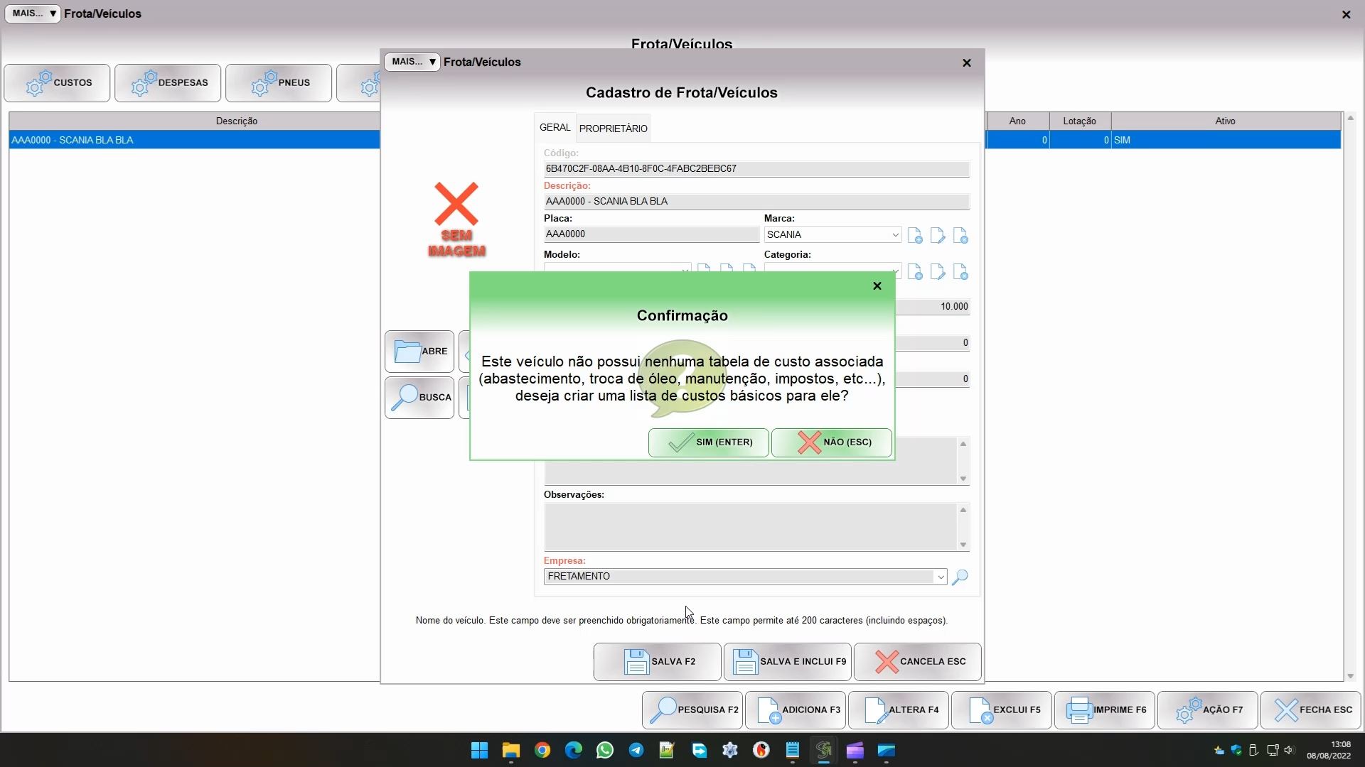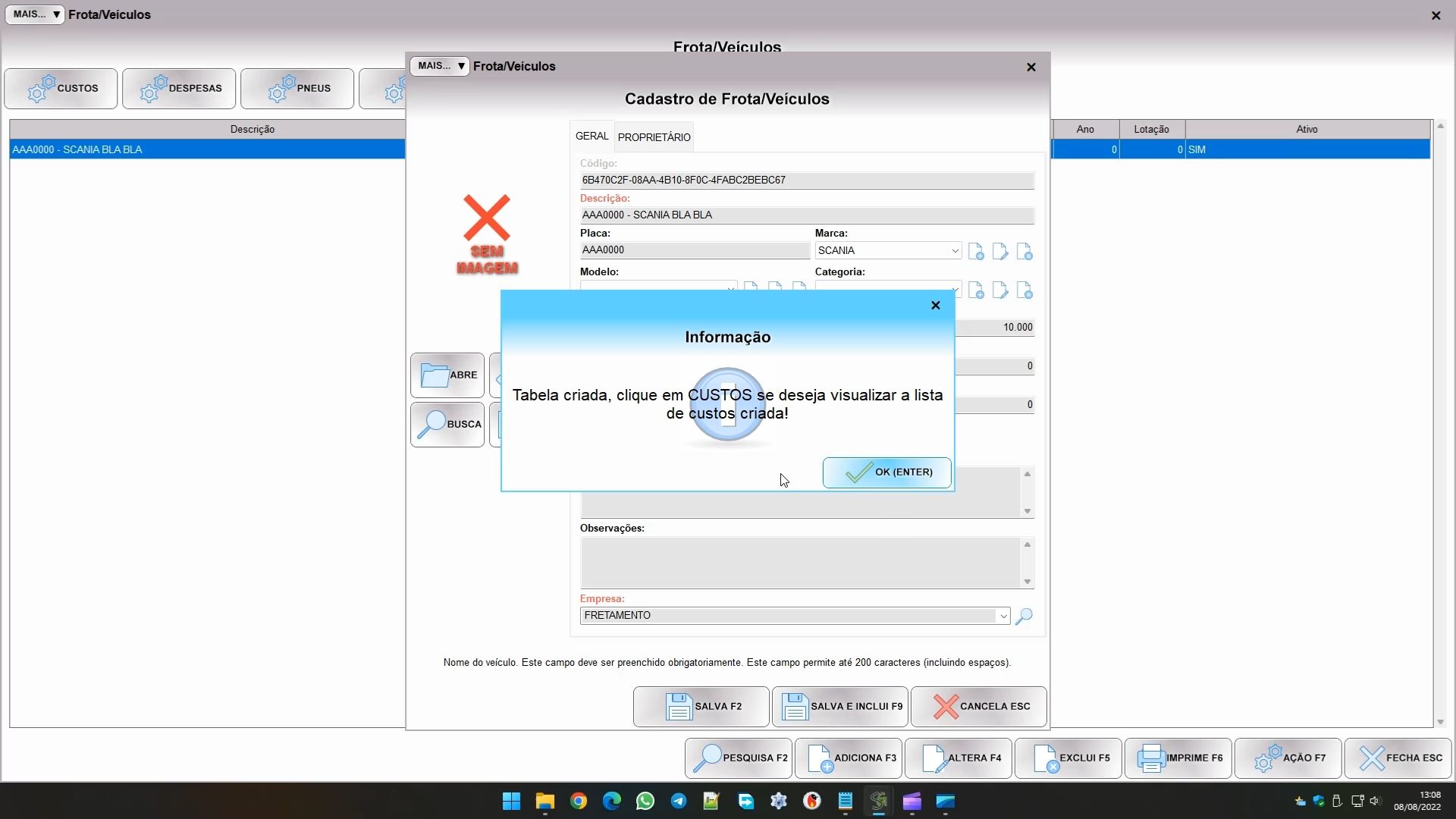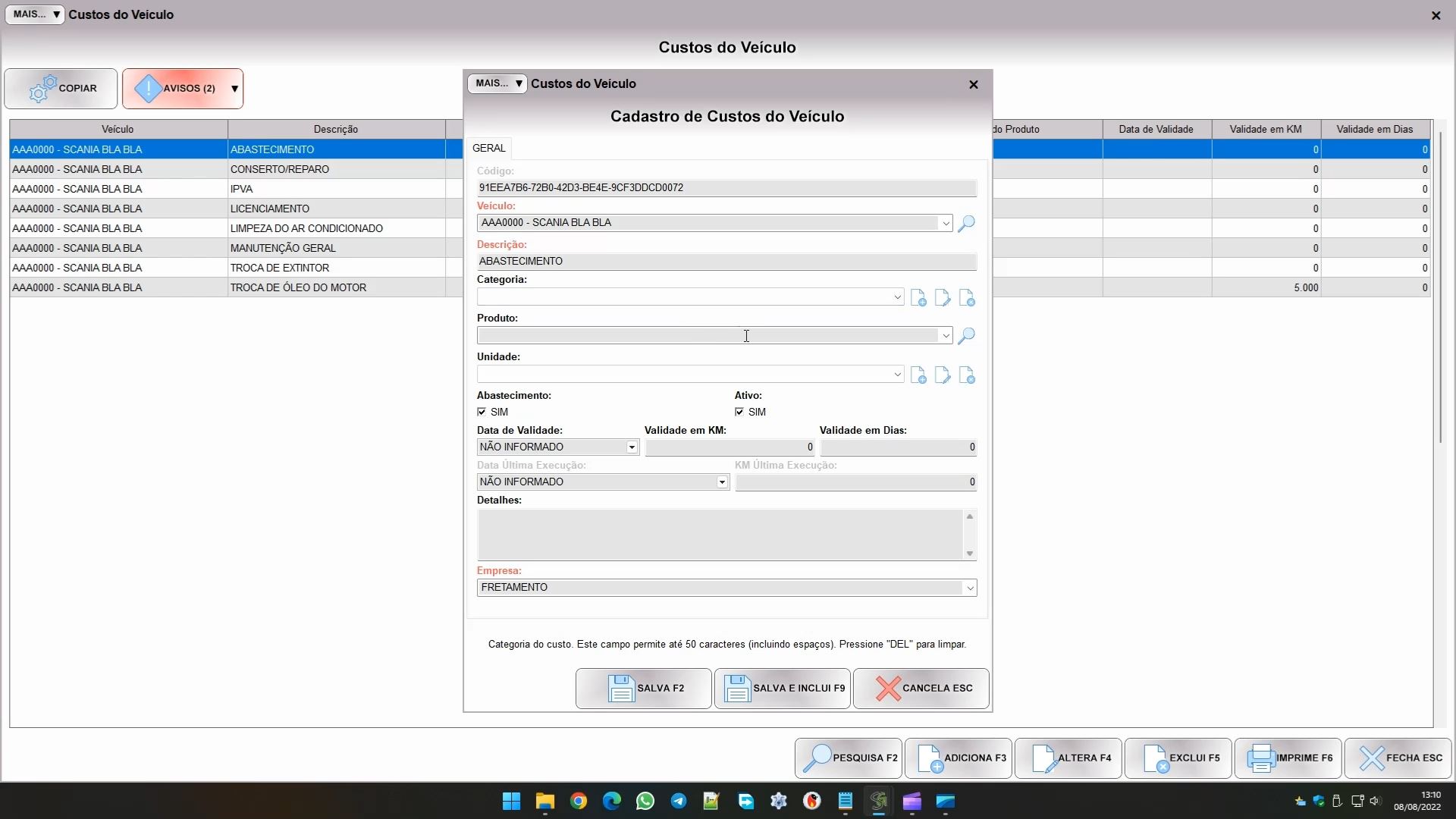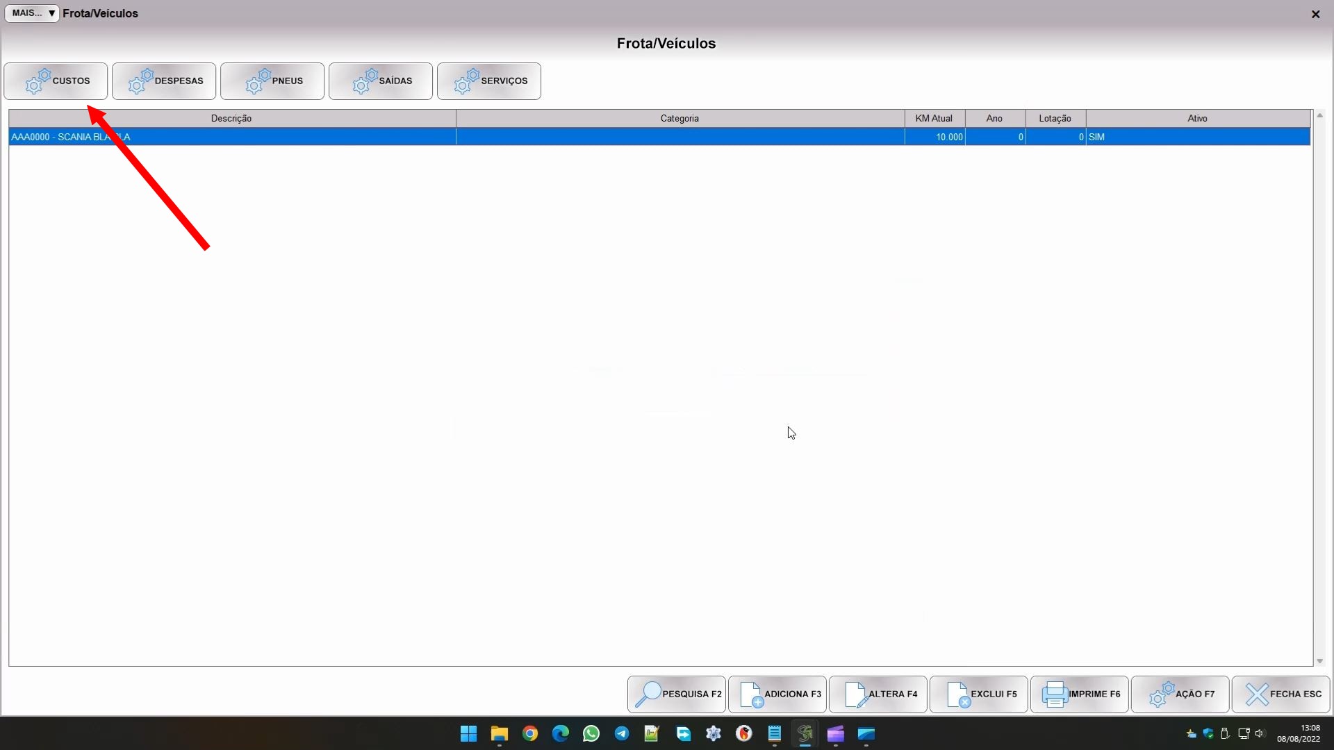 Veja que a mensagem indica para entrar em CUSTOS. É neste sub módulo que ficam as tabelas de custos de referência para as despesas do veículo. Você pode entrar pelo botão abaixo: