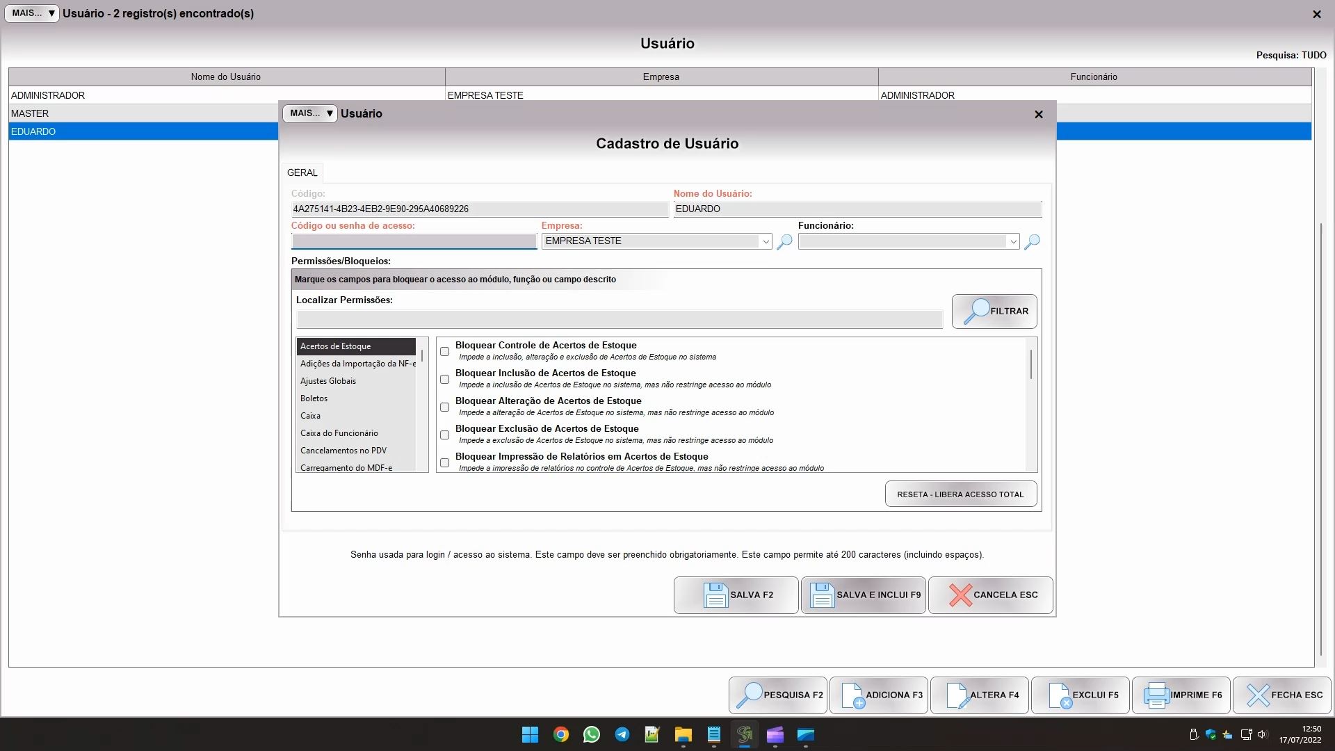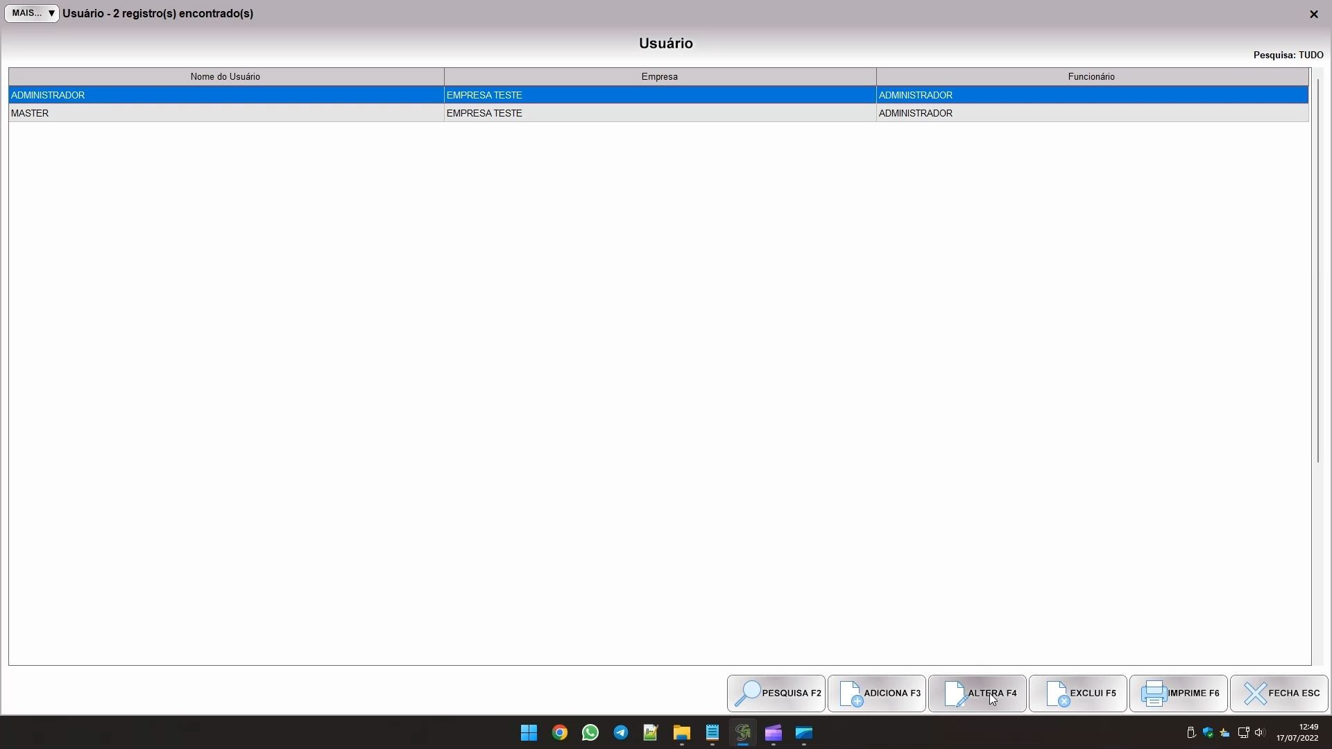 O software já vem com dois usuários. O MASTER serve para o desenvolvedor acessar o software em caso de necessidade, enquanto o ADMINISTRADOR é criado com o sistema e dá acesso completo a todas as funções. Nenhum dos dois usuários podem ser removidos, e você só consegue alterar o nome de usuário e senha do administrador. A senha padrão do usuário administrador é ADM.