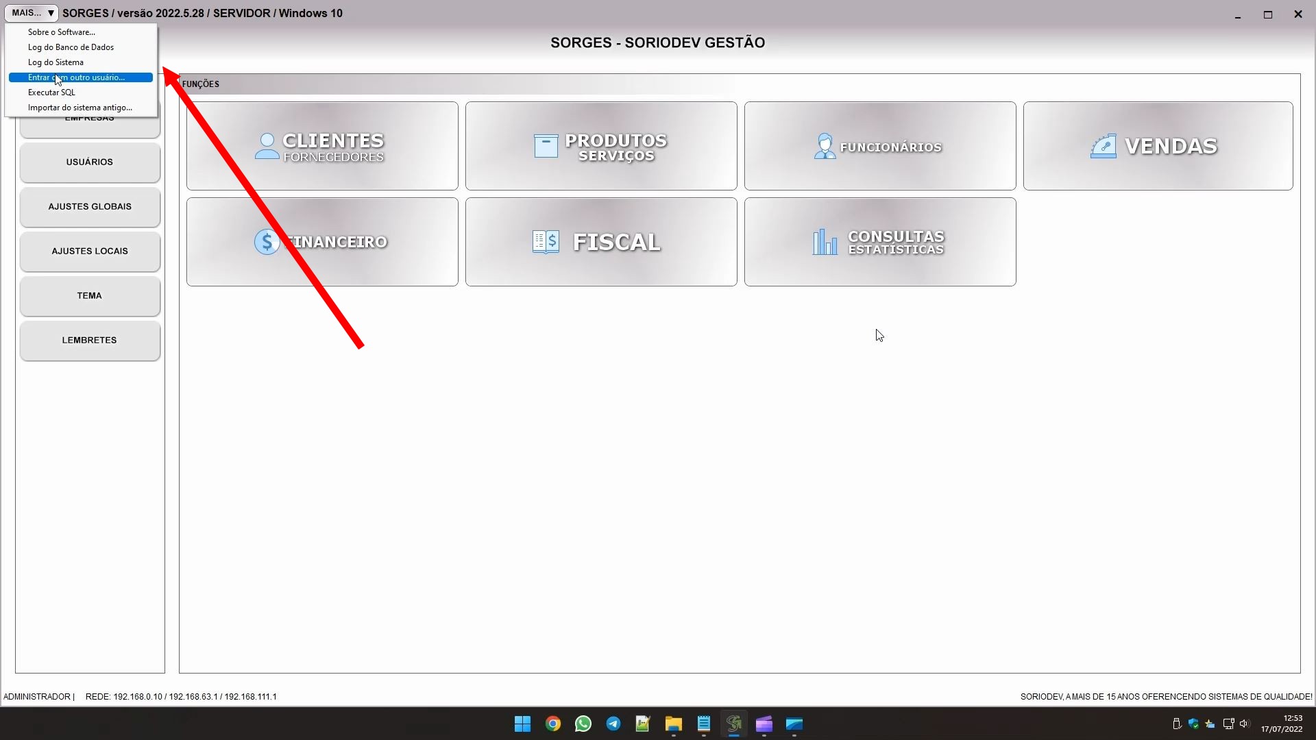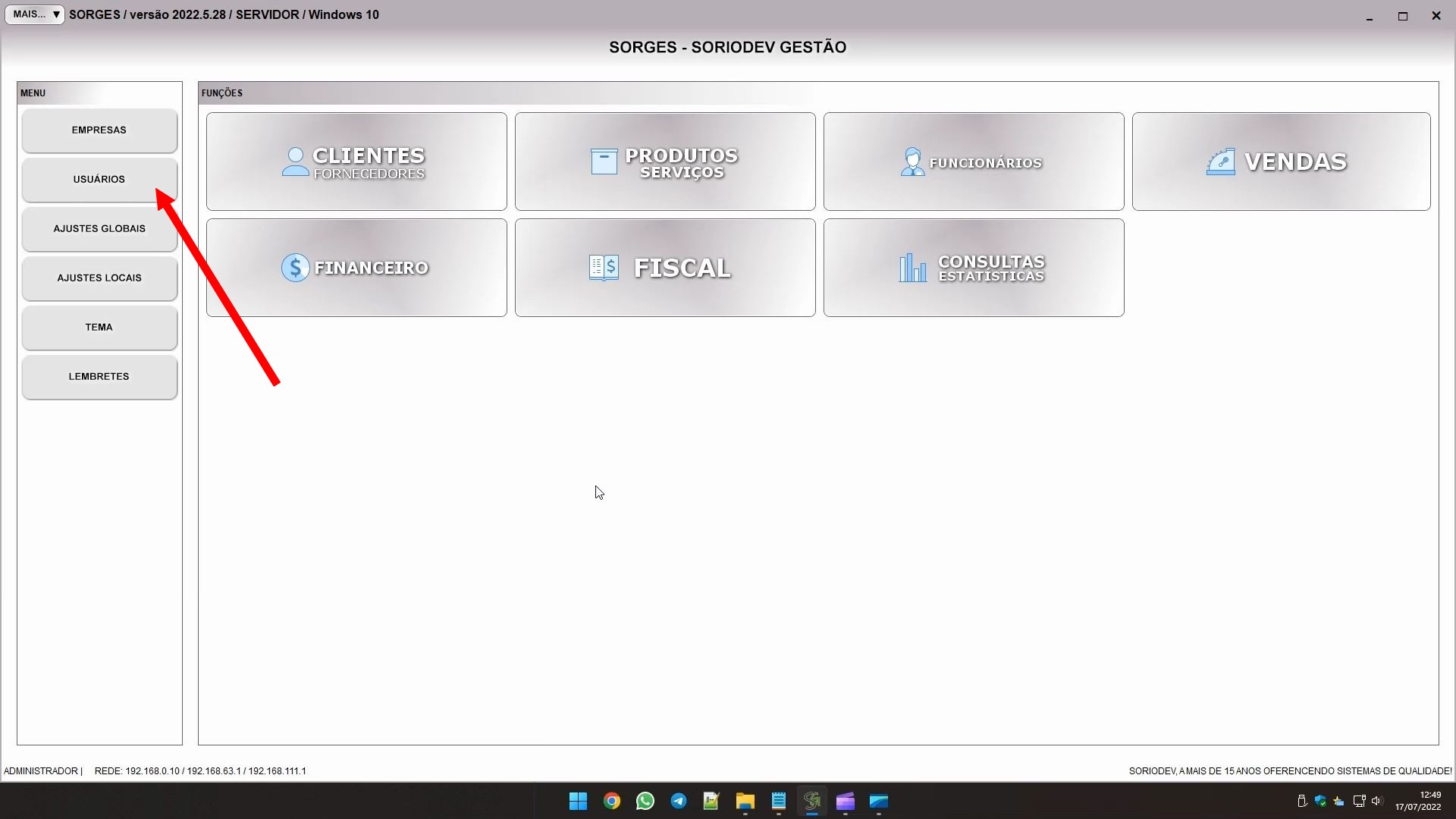 À esquerda na tela inicial do software você encontra o botão USUÁRIOS, que dá acesso ao controle de usuários.