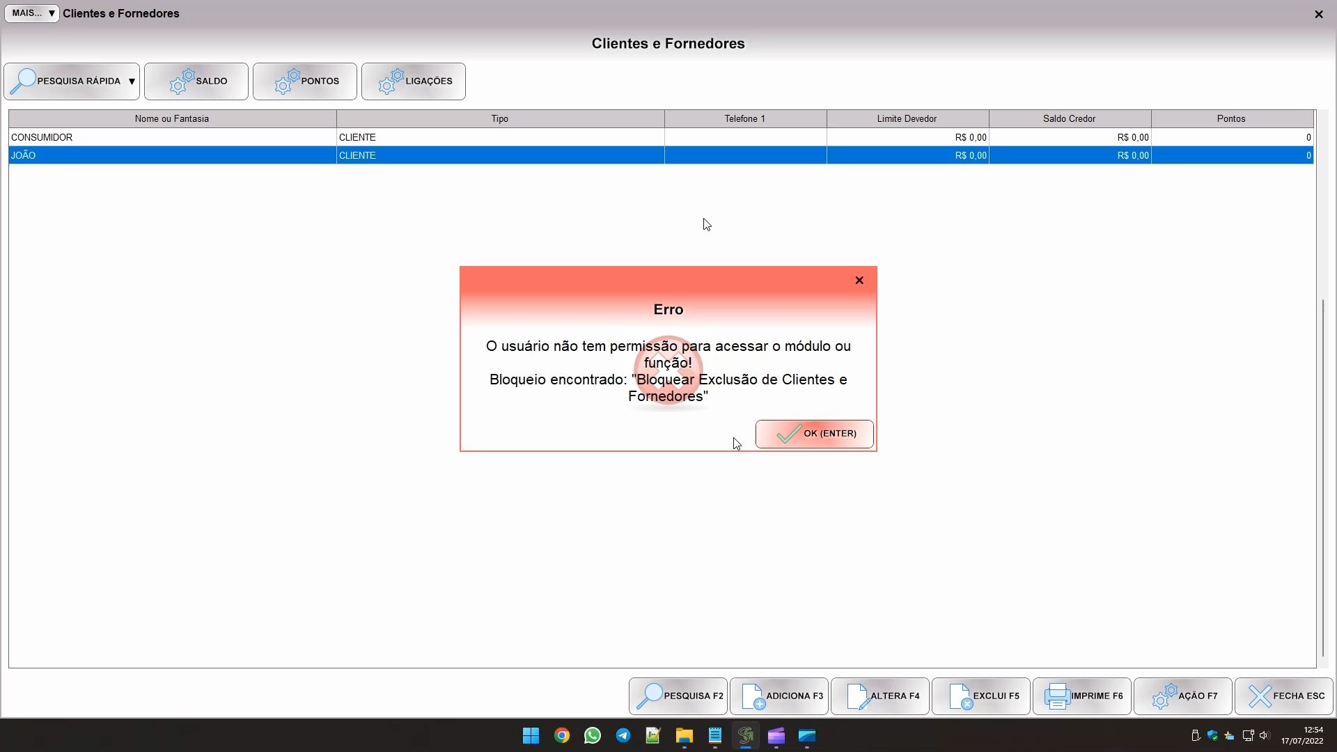 O sistema é bastante detalhado e possui permissões não só para bloquear o acesso aos módulos, como também para suas funções internar e seus campos. Por exemplo, se você clicar em CLIENTES E FORNECEDORES na lista esquerda terá acesso a todos os possíveis bloqueios deste módulo na lista da direita. Geralmente o primeiro bloqueio será BLOQUEAR CONTROLE DE “XXXX”, que bloqueia completamente o acesso ao módulo indicado em XXXX. Será possível ainda bloquear a inclusão, alteração e exclusão de cadastros, bloquear as funções exportar e importar, a impressão de relatórios, cada uma das funções dos botões no topo da tela e dos itens no menu do botão ação, e os próprios campos editáveis dentro do cadastro.