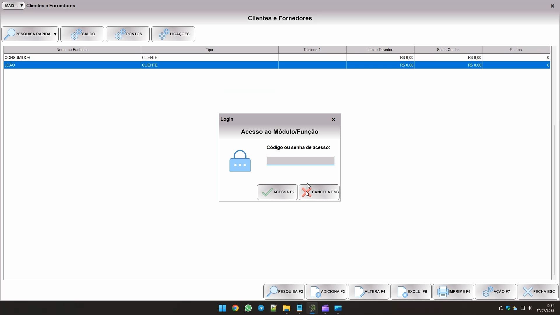 Caso você bloquei e campos no cadastro, o sistema simplesmente desativará os campos, mas eles não ficarão ocultos, somente não poderão ser alterados. Devido ao teor deste tipo de bloqueio não há como liberar o campo com senha. Porém, se o que foi bloqueado for uma função do sistema, ao tentar usar esta função ele exibirá a tela de login abaixo: