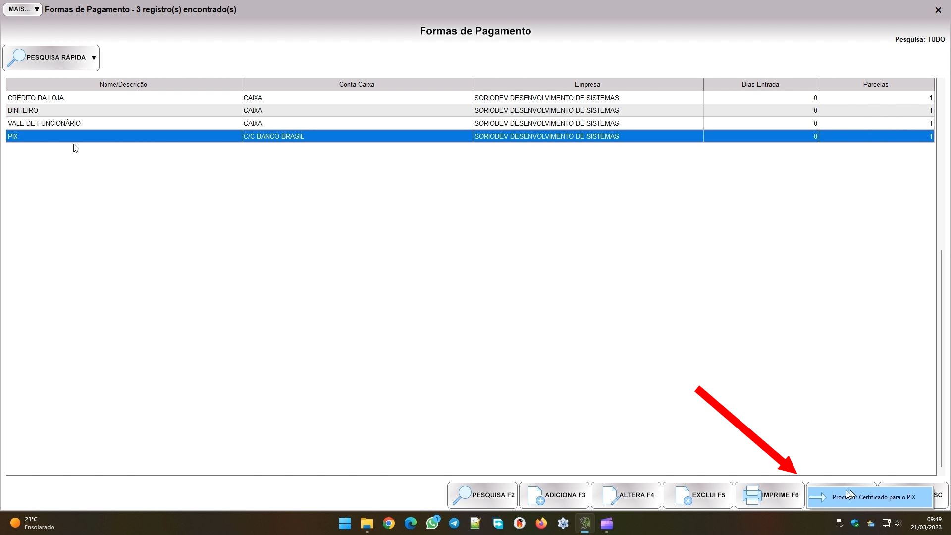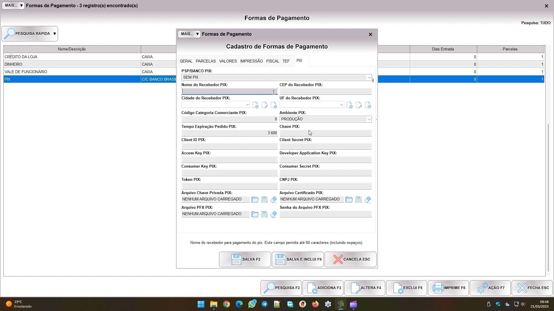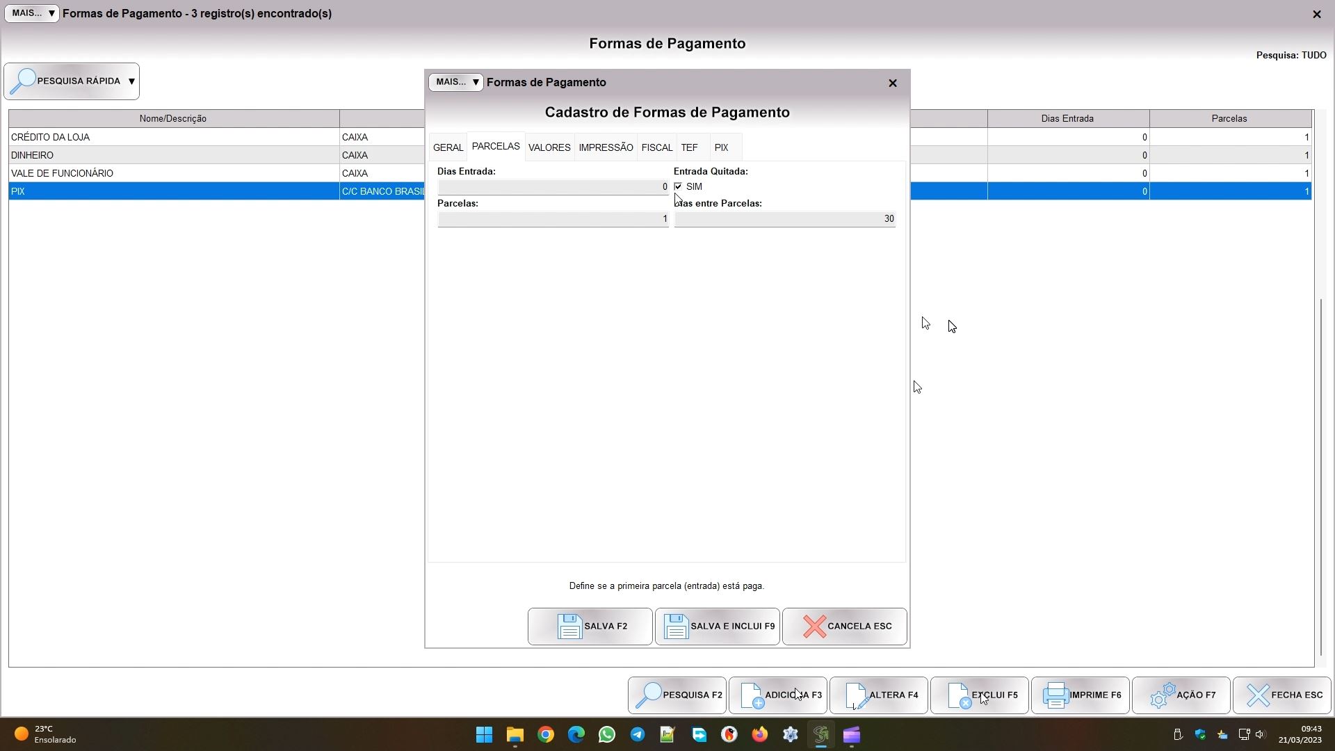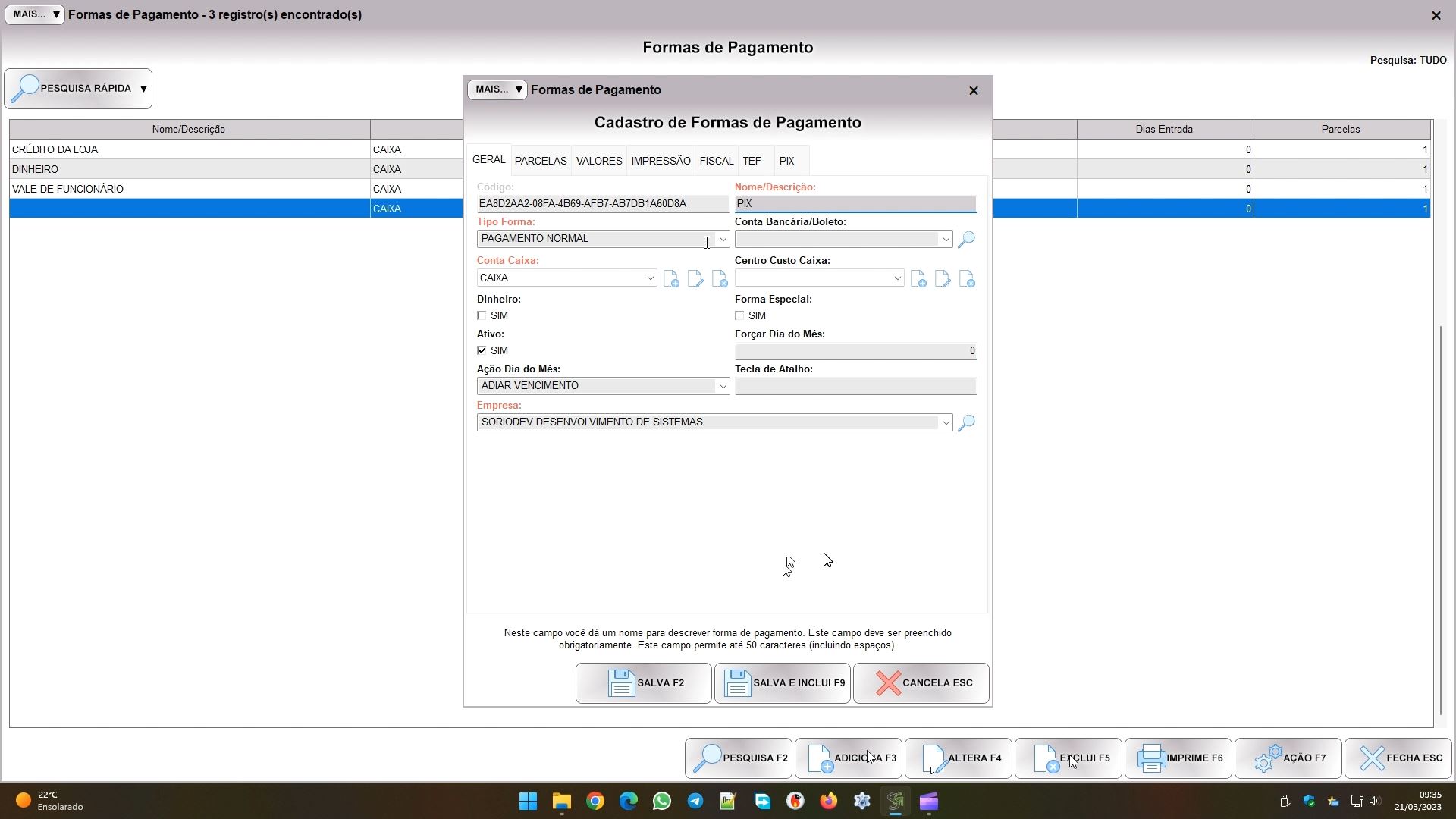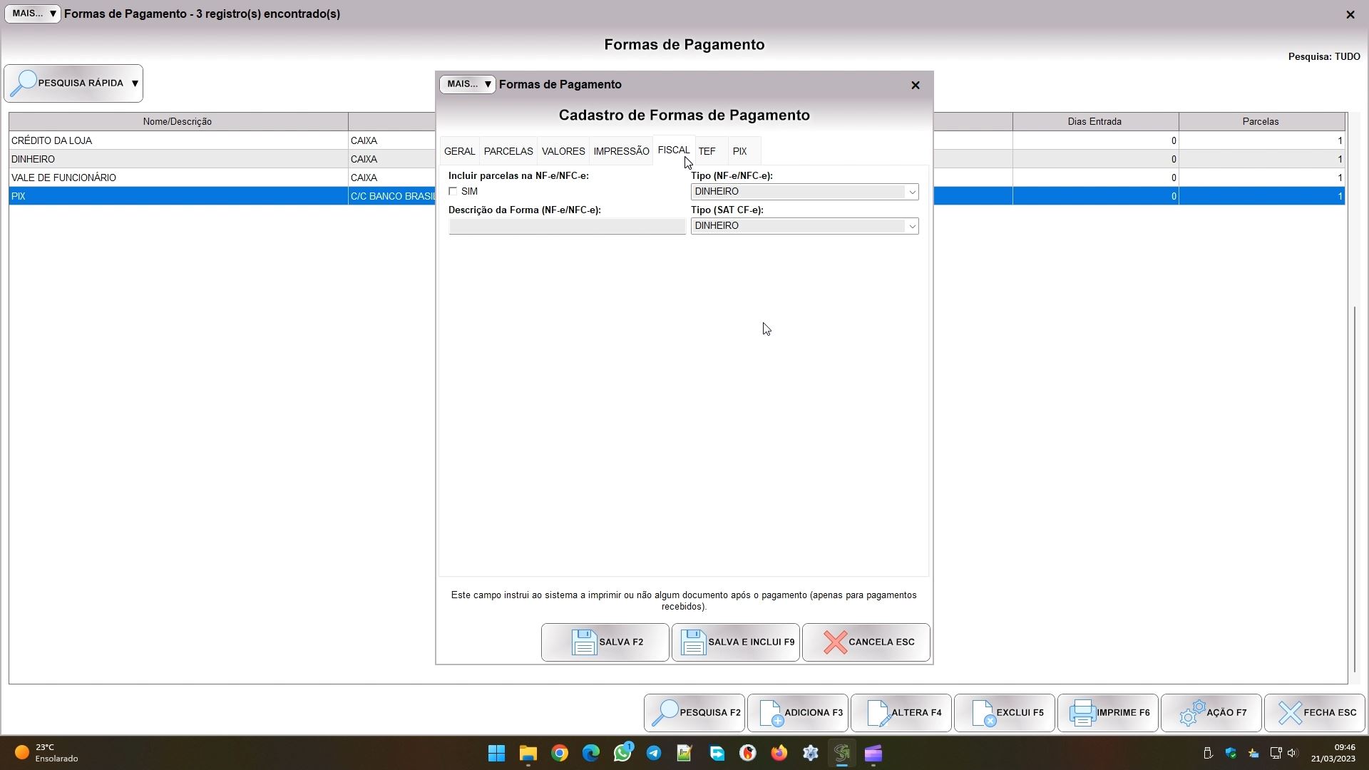 Já o campo TECLA DE ATALHO é para a tela de fechamento da venda no ponto de venda. Por questões óbvias não dá para mostrar todas as formas lá, então há um botão OUTRAS, que mostra uma lista delas, mas pode ser um pouco lento se o PDV tem muita fila. Então para agilizar um pouco pode usar esta tecla para definir uma letra, que funcionará como atalho na tela de fechamento. Desde que a letra não esteja em uso como outro atalho da tela, pressionar ela acionará o uso desta forma rapidamente.