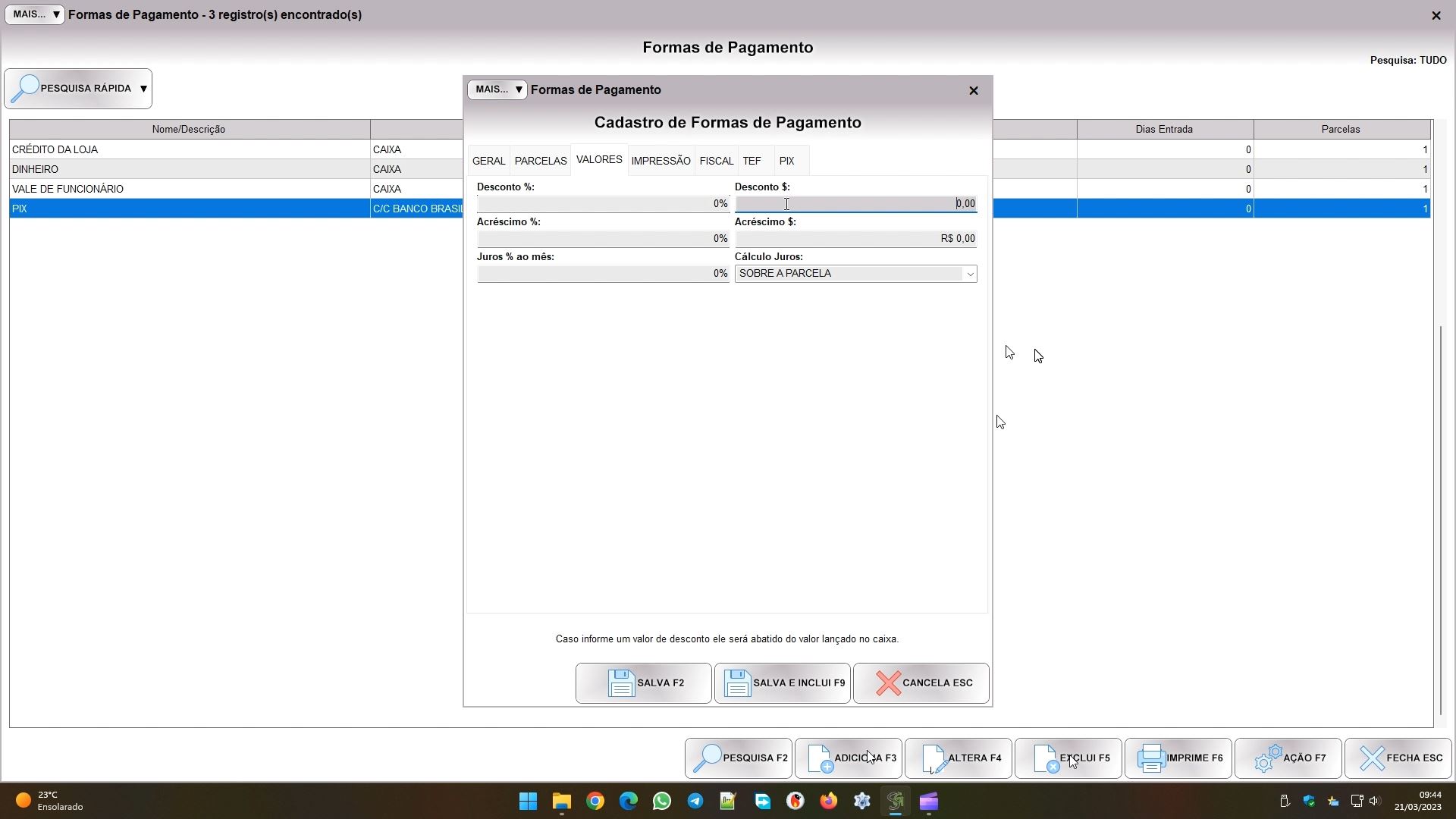 Tanto o desconto como o acréscimo pode ser em valor fixo ou percentual, e pode usar os 2 ao mesmo tempo se precisar. Por exemplo, alguns intermediadores on-line cobram taxa fixa por transação mais percentual, então pode informar os dois descontos, com a taxa fixa e o percentual.