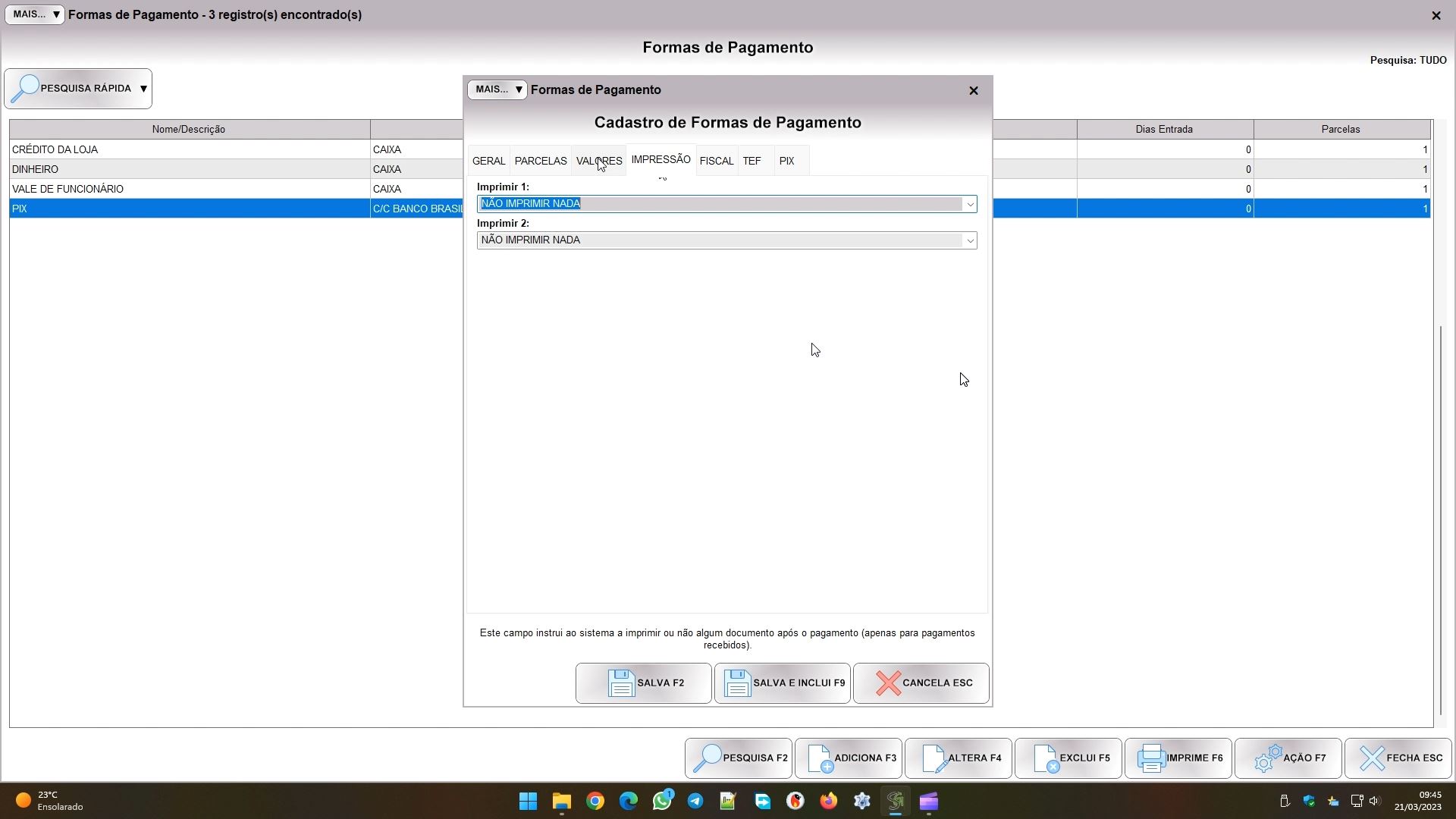 Aqui você pode escolher até 2 tipos de impressão, para quando fechar um pagamento usando esta forma. Tem várias opções, como carnê, promissória, boleto, fatura, etc…