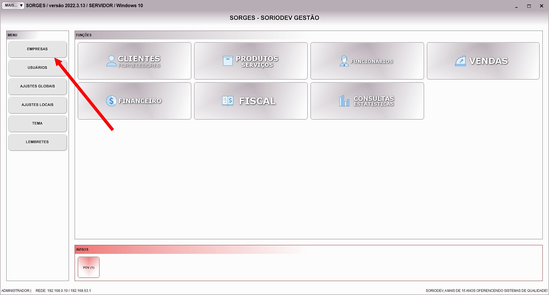 Esse controle é possível porque o software possui um cadastro de empresas, no qual você pode informar suas empresas. Para acessá-lo clique no botão EMPRESAS, à esquerda na tela inicial.