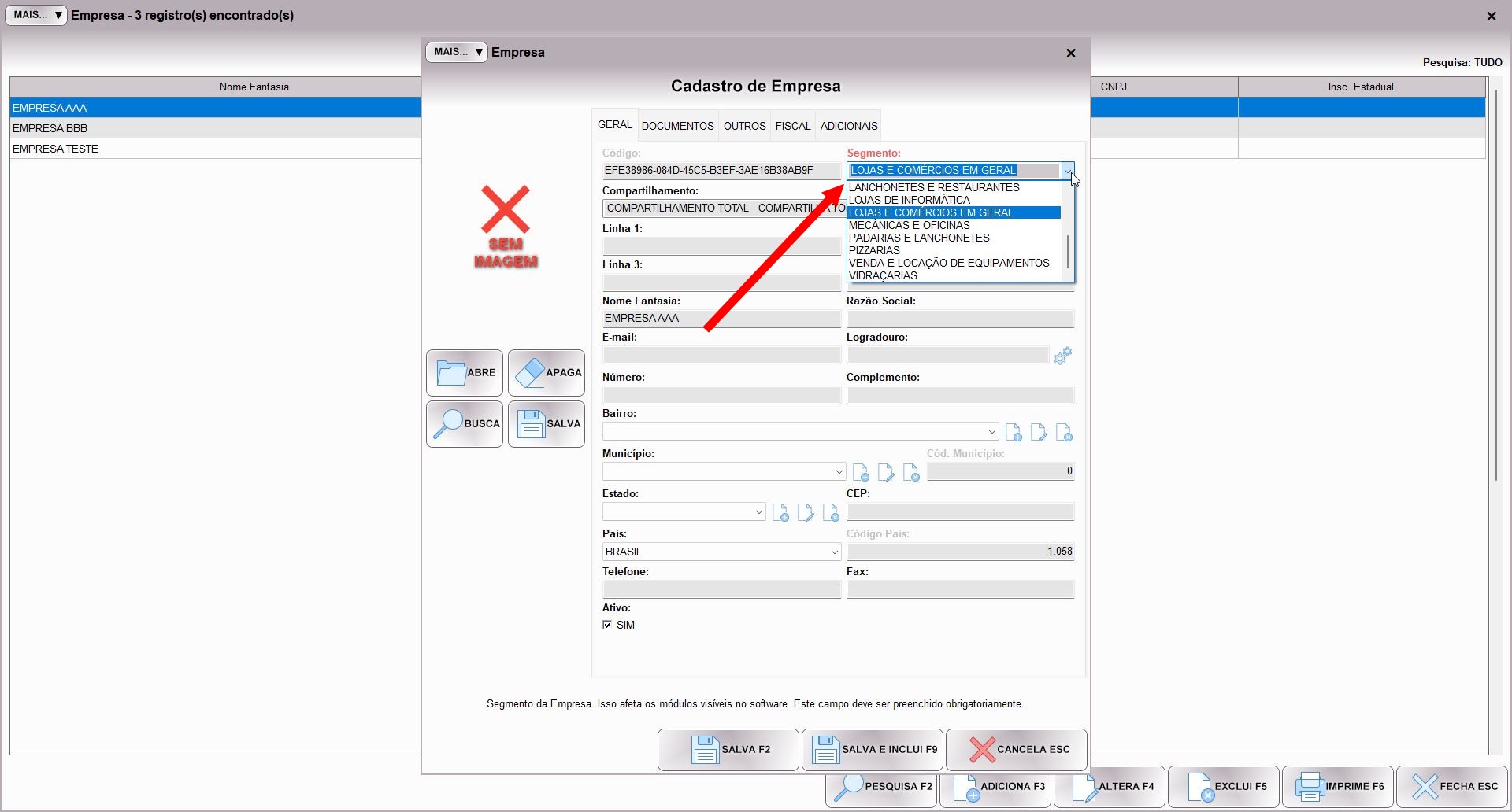 O primeiro deles é o campo SEGMENTO, e ele possui uma lista com os segmentos suportados pelo software. Caso use o SORGES LIGHT esse campo não existe, nesse caso pule para a explicação sobre o campo COMPARTILHAMENTO, mas abaixo. Seria impossível criar uma lista com todos os milhares de segmentos existentes, e você teria dificuldade em achar o seu, por isso este campo contém uma lista que corresponde aos 18 sistemas que foram migrados para o SORGES. O segmento de lojas e comércios, por exemplo, substitui o software GE-COMERCIO 4U, e vai atender muito bem a uma ampla variedade de empresas que comercializam produtos, em diversos segmentos.