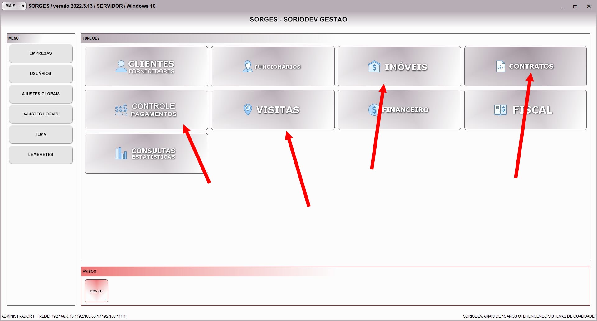 Já na imagem a seguir você vê o exemplo de uma imobiliária. Os módulos de produtos e vendas sumiram, e deram lugar aos módulos de imóveis, contratos, pagamentos e visitas.