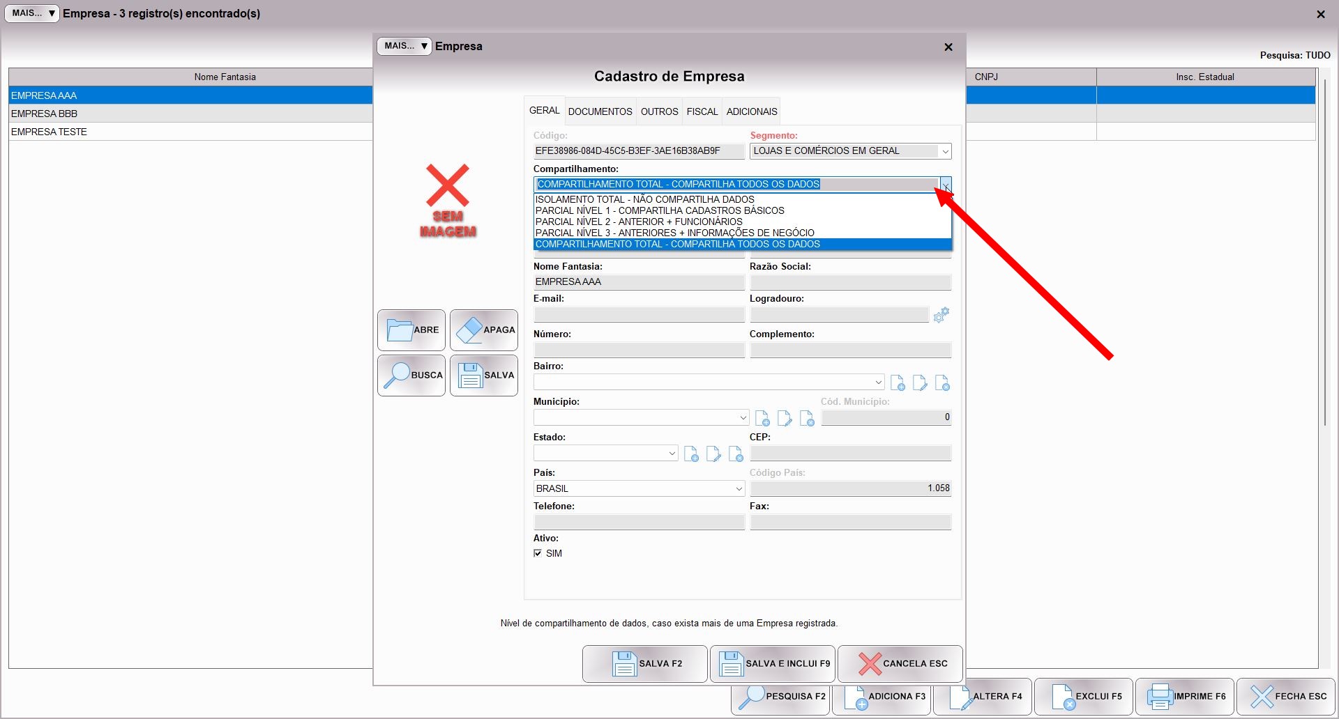 Voltando ao cadastro da empresa, temos ainda o segundo campo importante, que é o campo COMPARTILHAMENTO. Este campo se refere a visibilidade dos dados registrados no sistema. Se você tiver mais de uma empresa, é bastante provável que terá cadastros e movimentos vinculados a ambas elas. Porém, para manter uma independência entre elas você pode querer esconder as informações ou não. Este campo compartilhamento é exatamente para isso.
