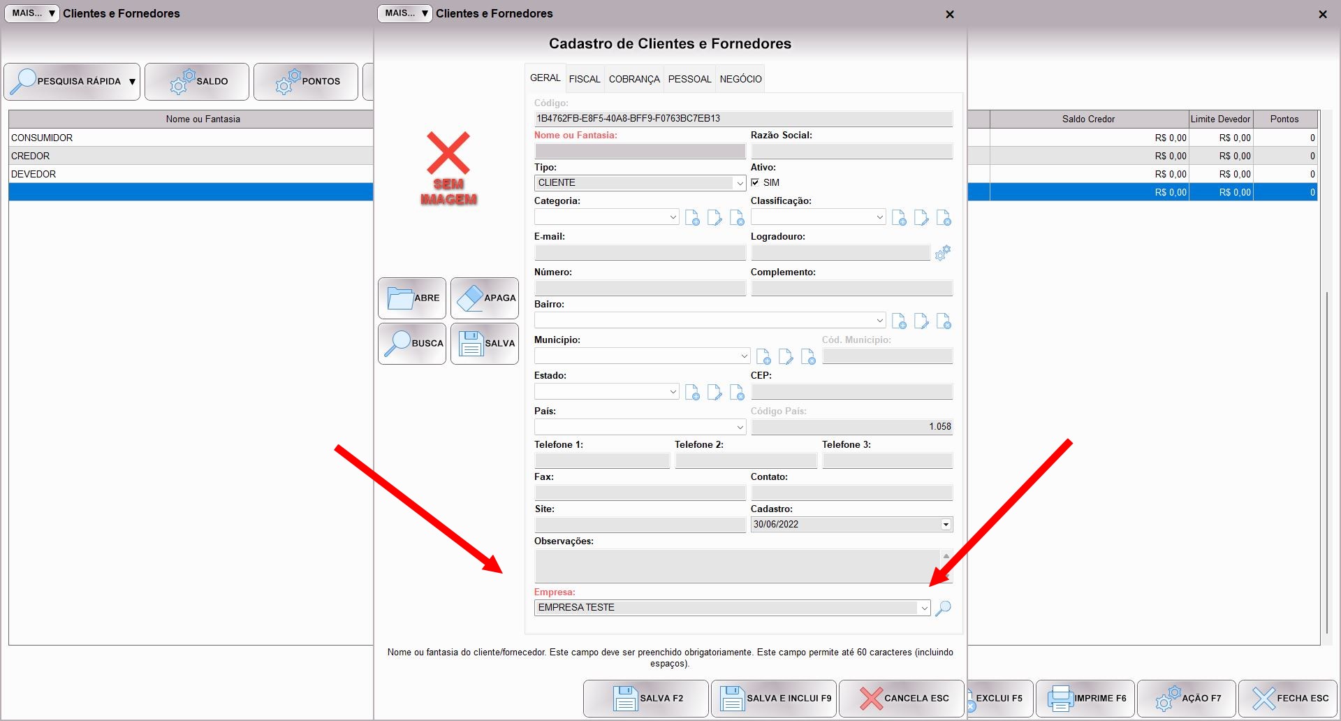 Quando você estiver cadastrando informações no sistema perceberá que na maioria dos cadastros existe um campo EMPRESA, que geralmente fica no final da tela de cadastro. Se o cadastro tem várias abas, geralmente está no final da aba GERAL, igual na imagem abaixo, do cadastro do cliente.