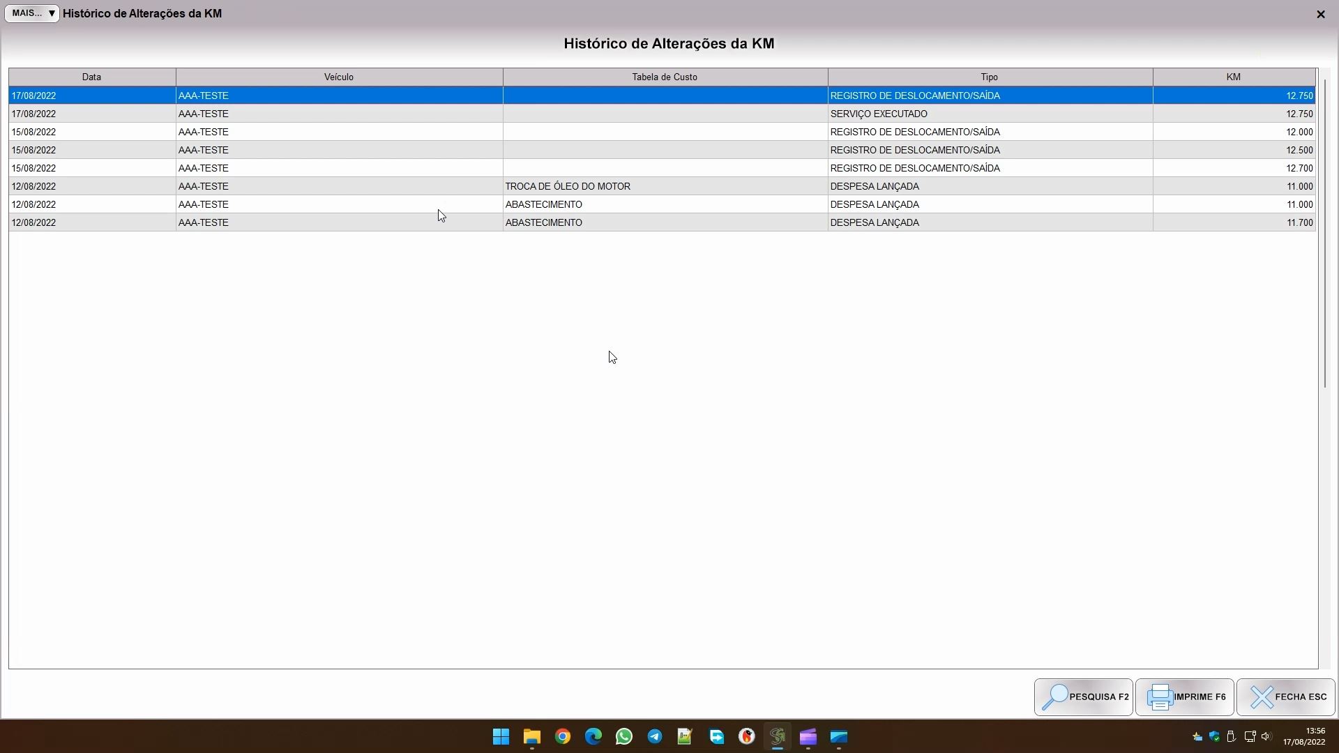 A consulta trás a data, o veículo, o tipo, a km registrada, e no caso das despesas, também trás a tabela de custo. Com isso consegue ver as alterações que foram feitas, o tipo de movimento e a data. Achando a km errada na lista você consegue ir até o módulo indicado no campo tipo e fazer a pesquisa na data indicada, para conseguir achar e corrigir o erro.