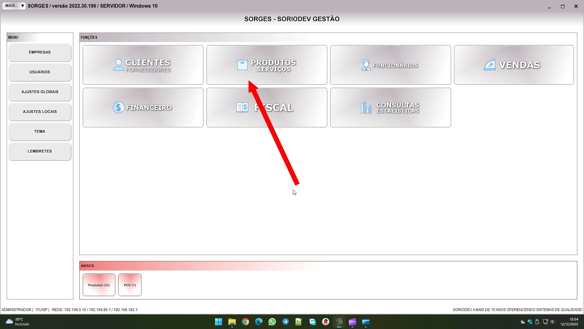 O controle de produtos pode ser acessado pelo botão PRODUTOS/SERVIÇOS na tela inicial.