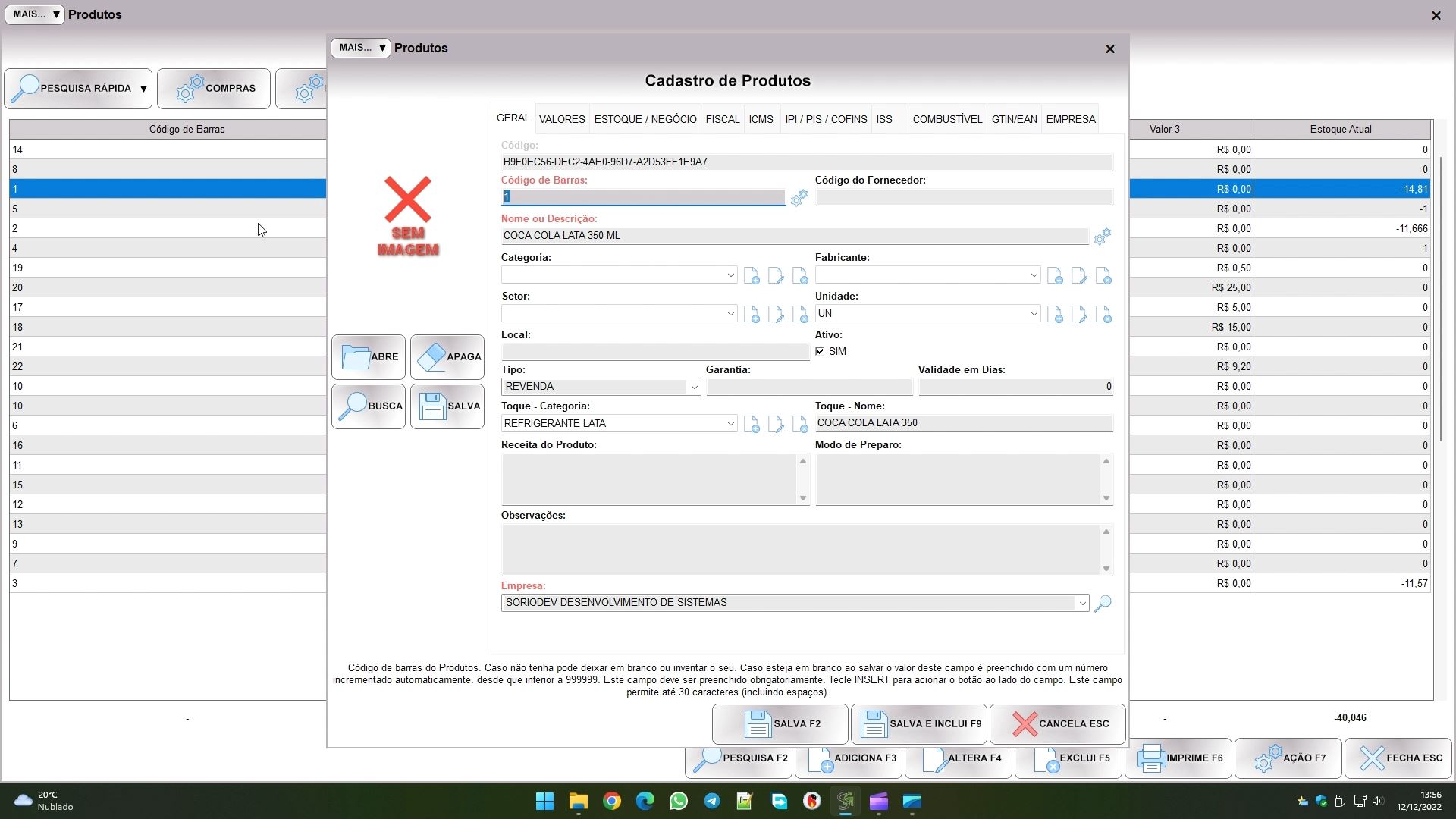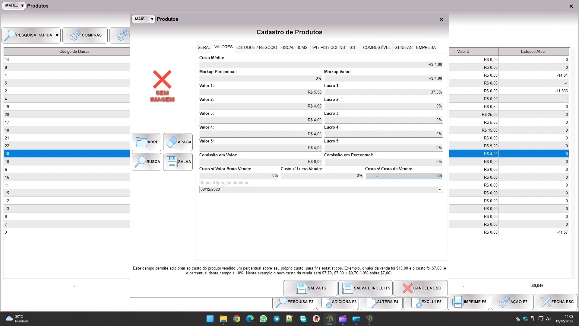 Após esta primeira aba, temos na segunda, VALORES, os campos que armazenam os valores de custo, venda e comissão dos produtos: