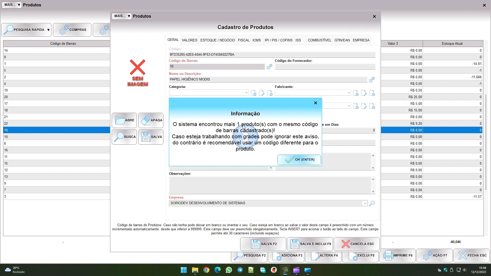 Outro detalhe útil é que você pode usar códigos repetidos, algo que será útil caso trabalhe com grades. Se isso ocorrer, ao salvar o produto verá uma mensagem igual a imagem abaixo. Se você trabalha com grades irá criar vários cadastros, com cores e tamanhos diferentes do mesmo produto, então pode ignorar esta mensagem.