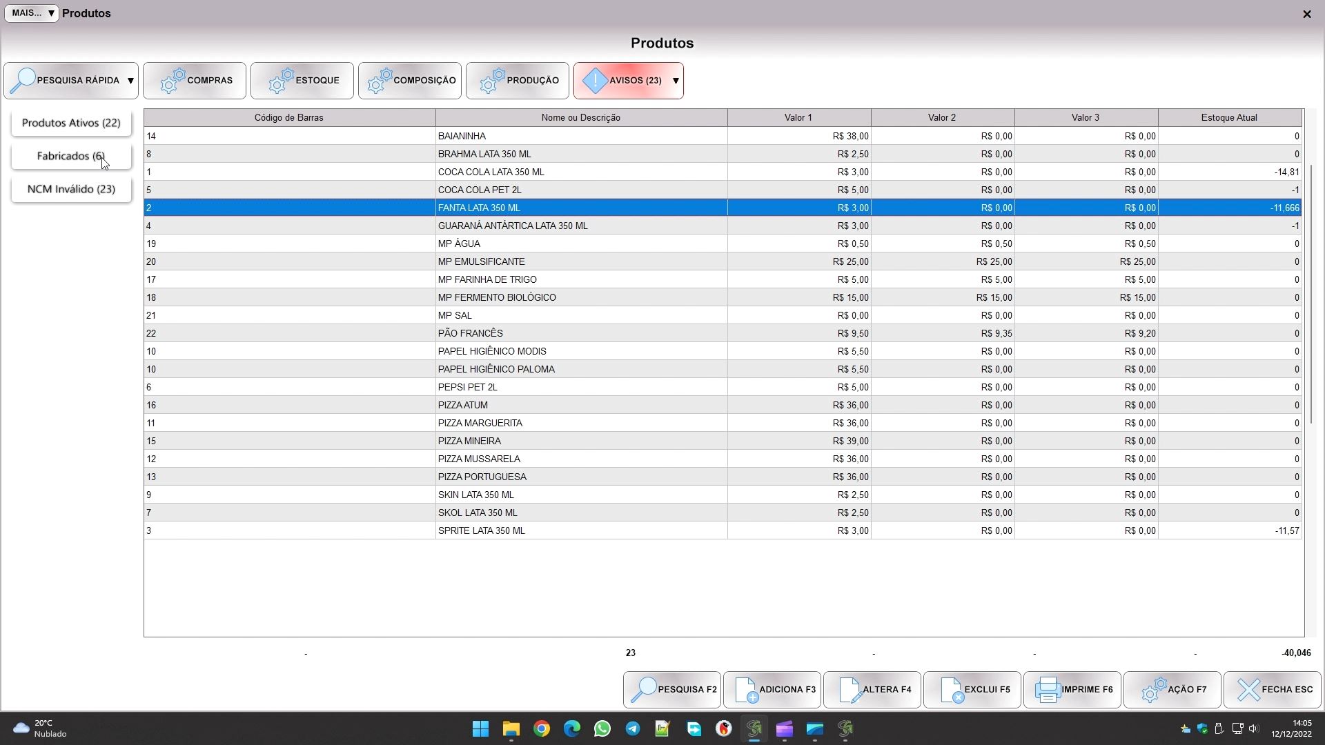 Voltando a tela de controle, pelo botão PESQUISA RÁPIDA conseguimos ver algumas opções de busca, como ver todos os produtos ativos, todos os fabricados, ou todos os que tem ncm inválido. São opções para facilitar a montagem de algumas listas.