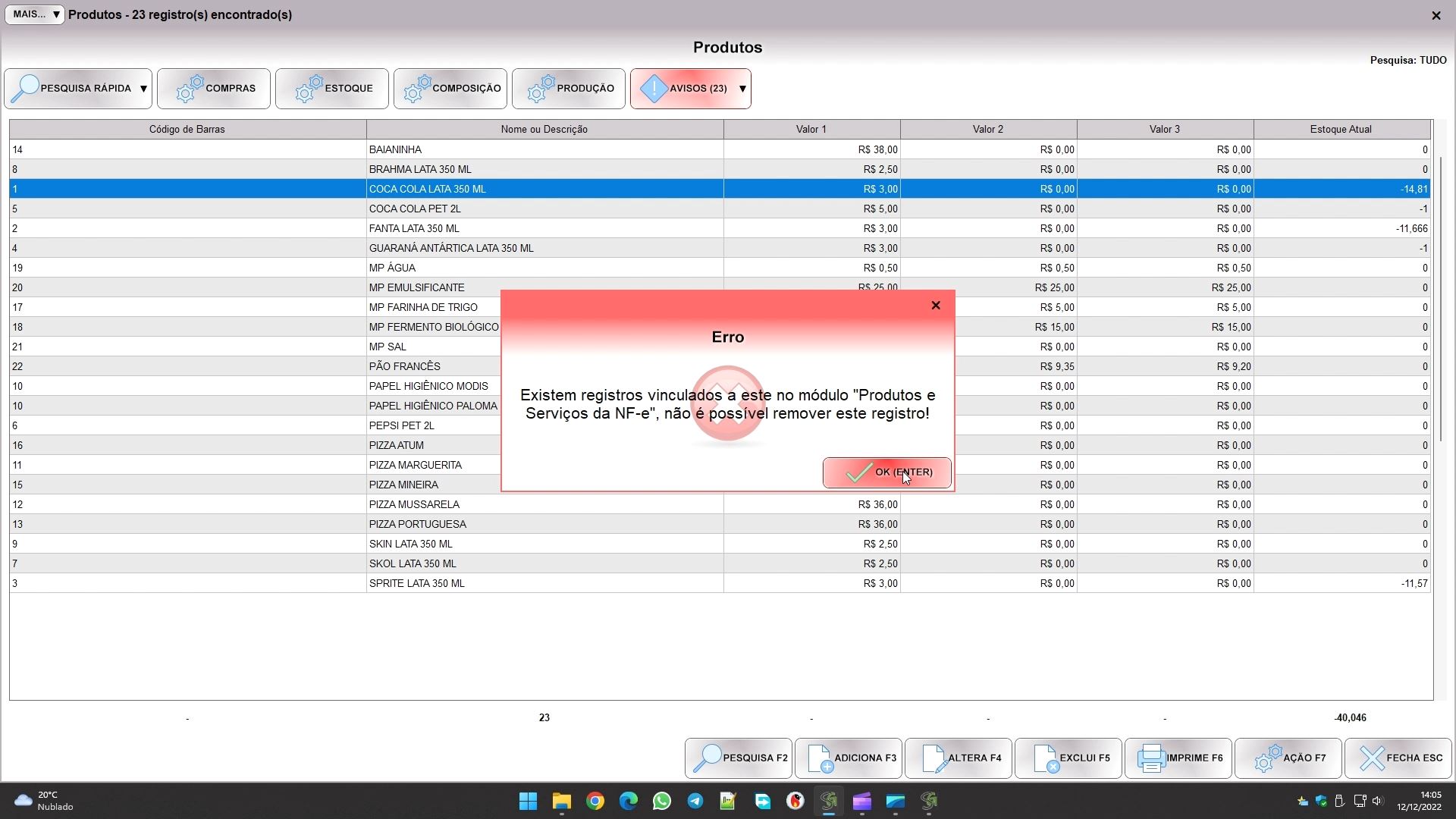Para finalizar, caso tente excluir um produto já usado, o sistema bloqueará, como já explicamos anteriormente. Ele exibe uma mensagem similar a esta: