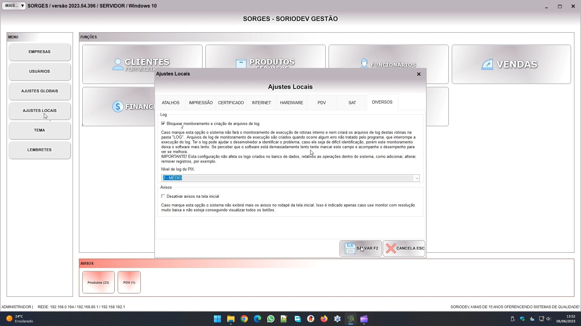 A primeira delas fica em AJUSTES LOCAIS, na aba DIVERSOS. Ali você encontrará a configuração BLOQUEAR MONITORAMENTO E CRIAÇÃO DE ARQUIVOS DE LOG. Quando ocorre algum erro no sistema que não foi previsto por nós, ele vai gerar uma “exceção”, uma mensagem que muitas não ajuda muito a identificar o porque daquele erro. Caso este campo esteja desmarcado o sistema criará na pasta C:\SORIODEV\SORGES\LOGS um arquivo de log que contém a mensagem de erro e as funções que internamente ele executou antes de ocorrer este erro. Isto pode nos ajudar a identificar o motivo do erro e descobrir uma forma de evitá-lo ou corrigi-lo. Porém, se o programa está funcionando sem problemas, isso também significa que este log é desnecessário, e assim pode marcar este campo para que o log não seja criado.