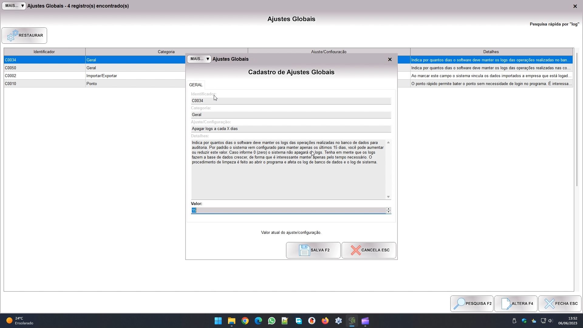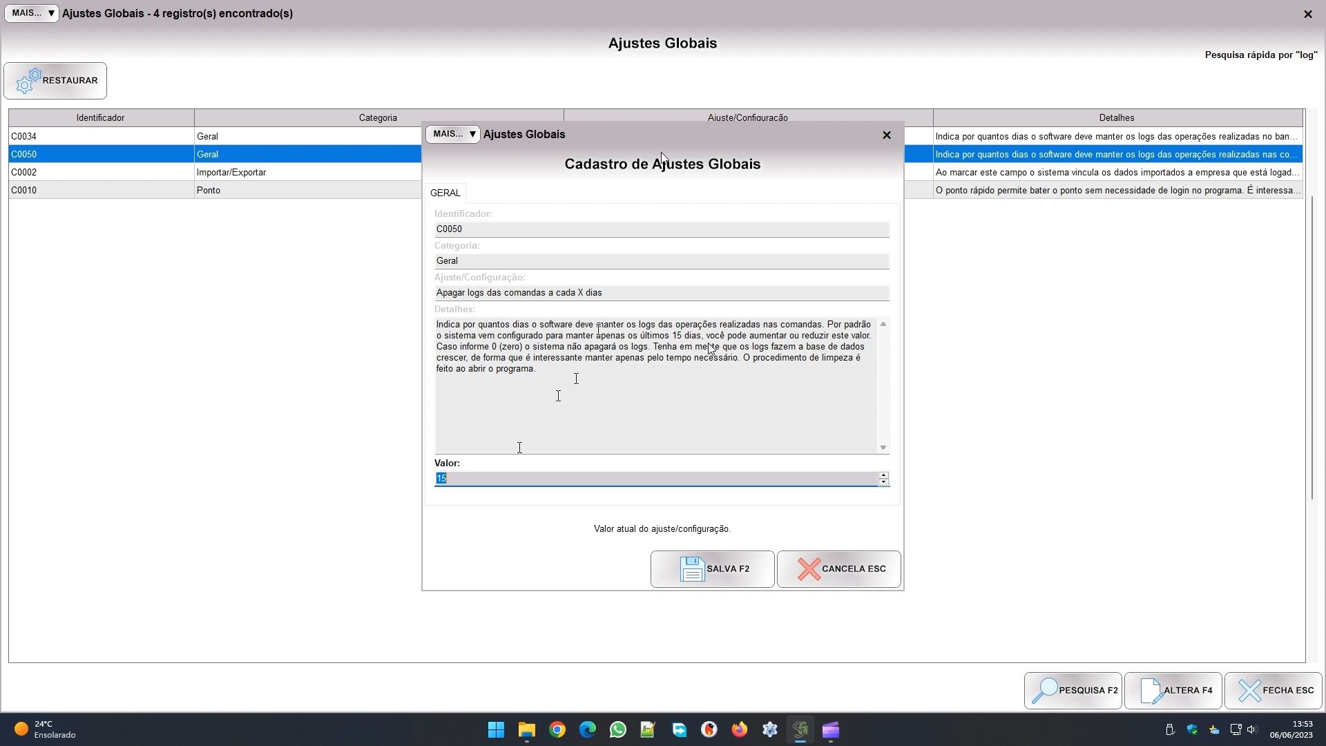 Por padrão o sistema mantém logs dos últimos 15 dias. Você pode aumentar ou diminuir esse tempo de acordo com sua necessidade. Se é muito importante manter o rastro dos funcionários por mais tempo pode aumentar. Porém se só você usa o programa pode até reduzir para 1 dia, por exemplo. Antes da versão 2023.64.486, informar 0 fazia com que o sistema não limpe mais os logs, não era recomendado fazer isso. A partir da versão 2023.64.486, informa 0 fará com que o sistema interrompa o monitoramento e não gere logs, o que deve deixar ele bem mais rápido. Quanto mais tempo ele mantém logs, maior ficará a base de dados, e mais lenta ela tende a se tornar.