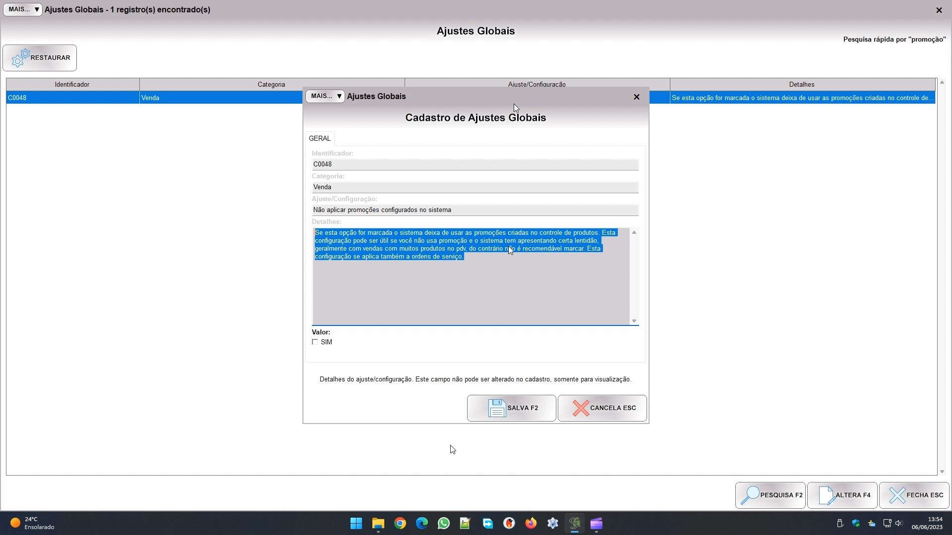 Temos ainda um outro ajuste, o C0048. Caso desmarque o sistema não vai mais aplicar as promoções dos produtos, por isso altere somente se realmente não precisa delas: